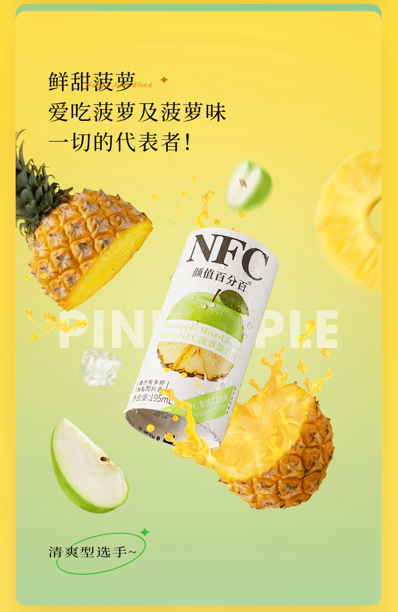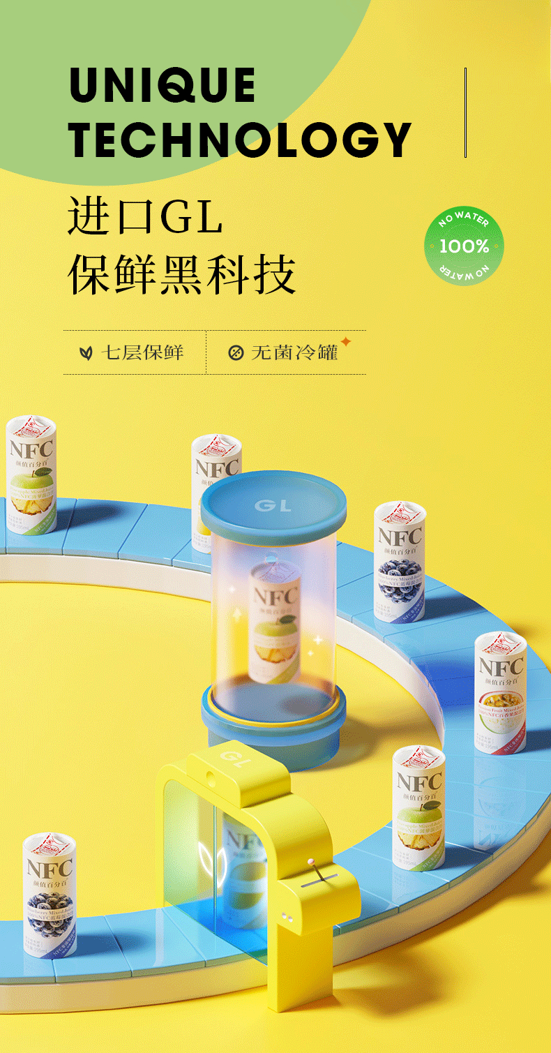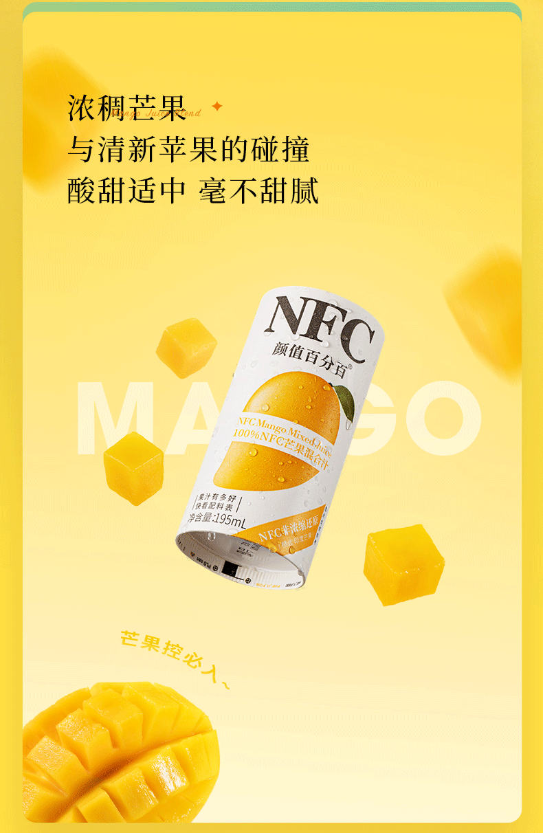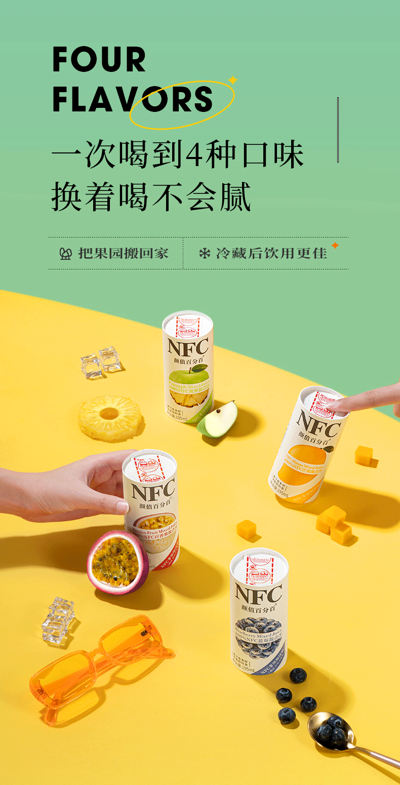NFC果汁(Not From Concentrate,即非浓缩还原汁),就是将新鲜原果清洗后采用集汁管取汁的先进工艺,经瞬间杀菌后直接灌装,在低温环境中加工而成不经浓缩复原,最大限度保留了水果原有的新鲜风味和营养。