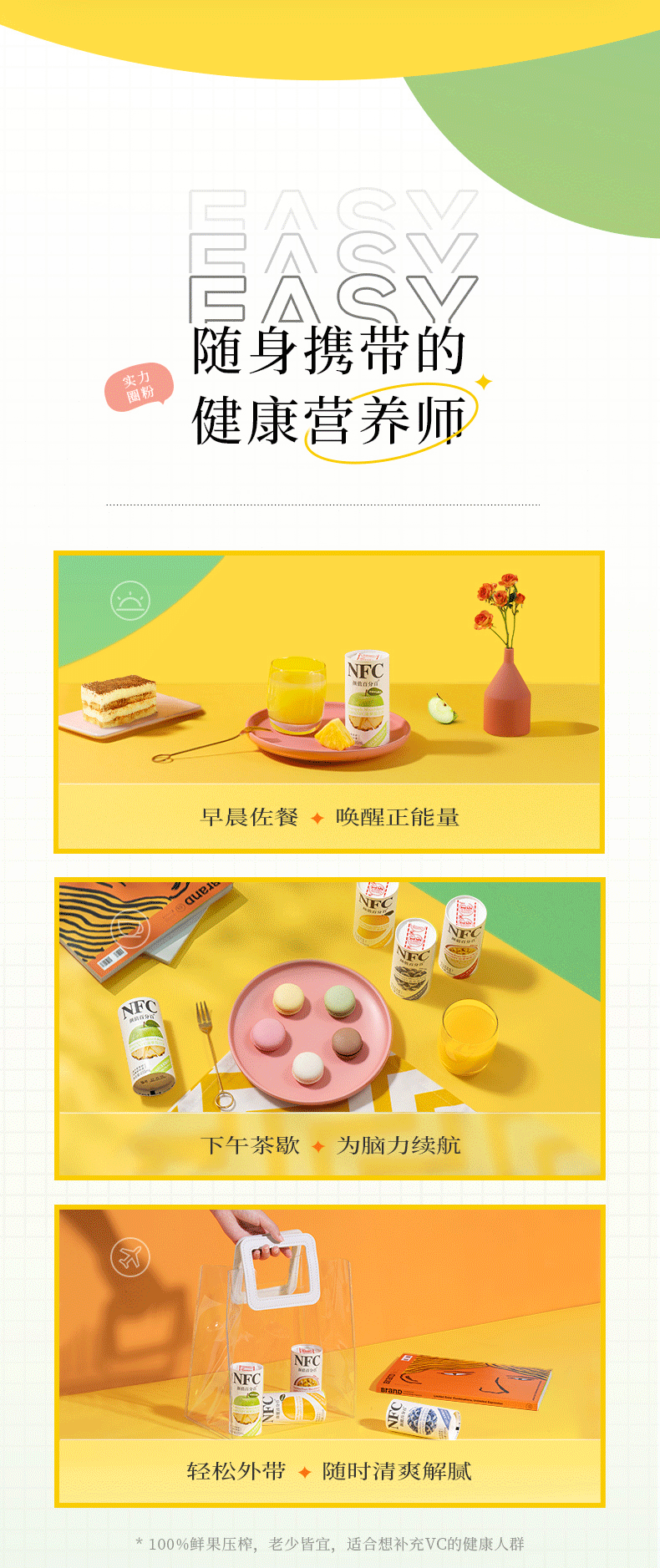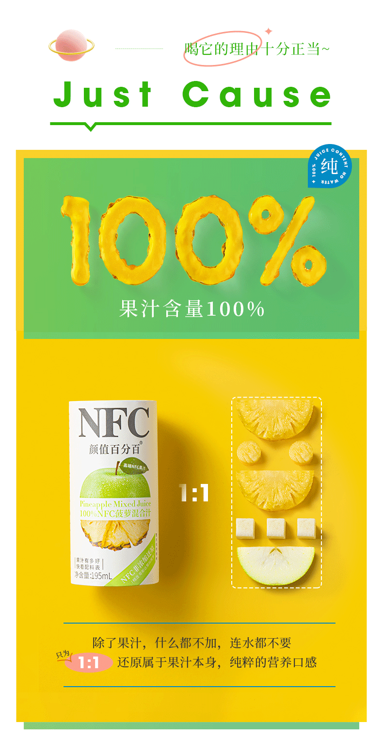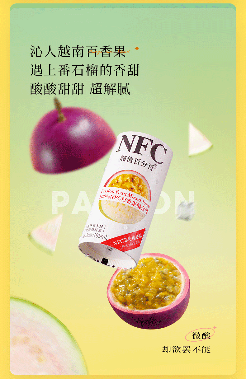 NFC果汁(Not From Concentrate,即非浓缩还原汁),就是将新鲜原果清洗后采用集汁管取汁的先进工艺,经瞬间杀菌后直接灌装,在低温环境中加工而成不经浓缩复原,最大限度保留了水果原有的新鲜风味和营养。