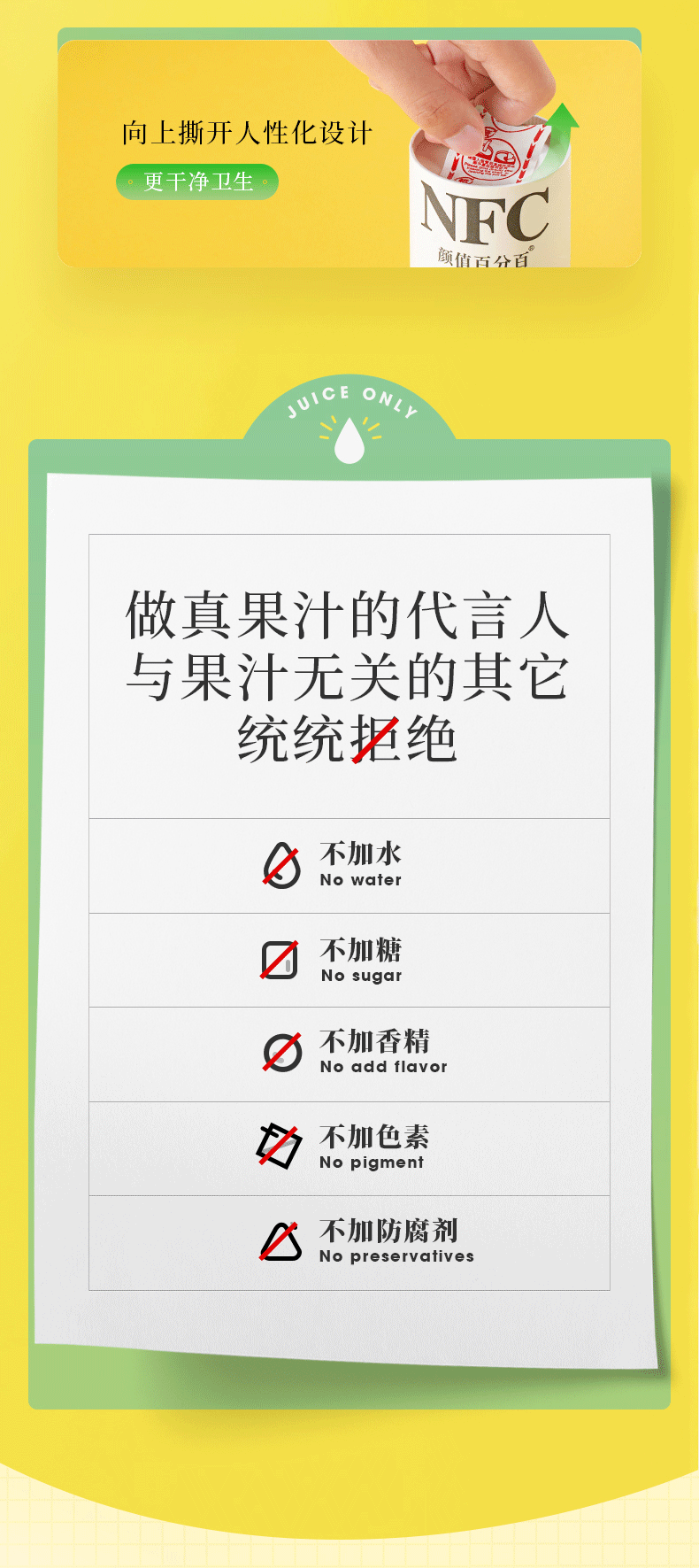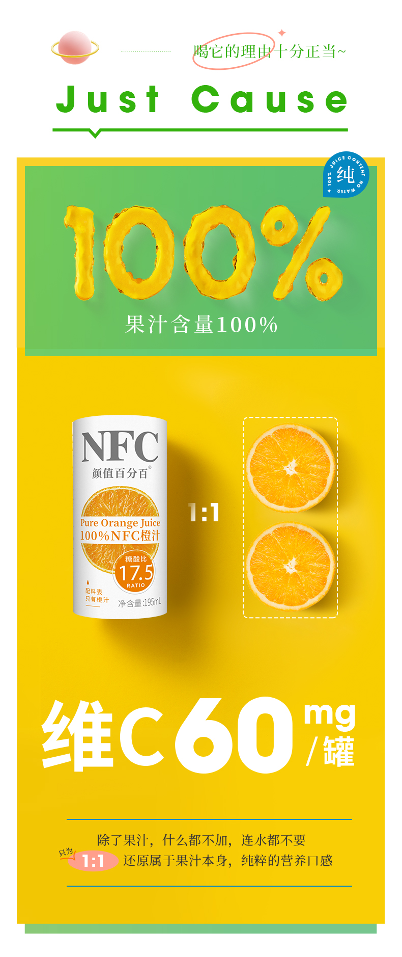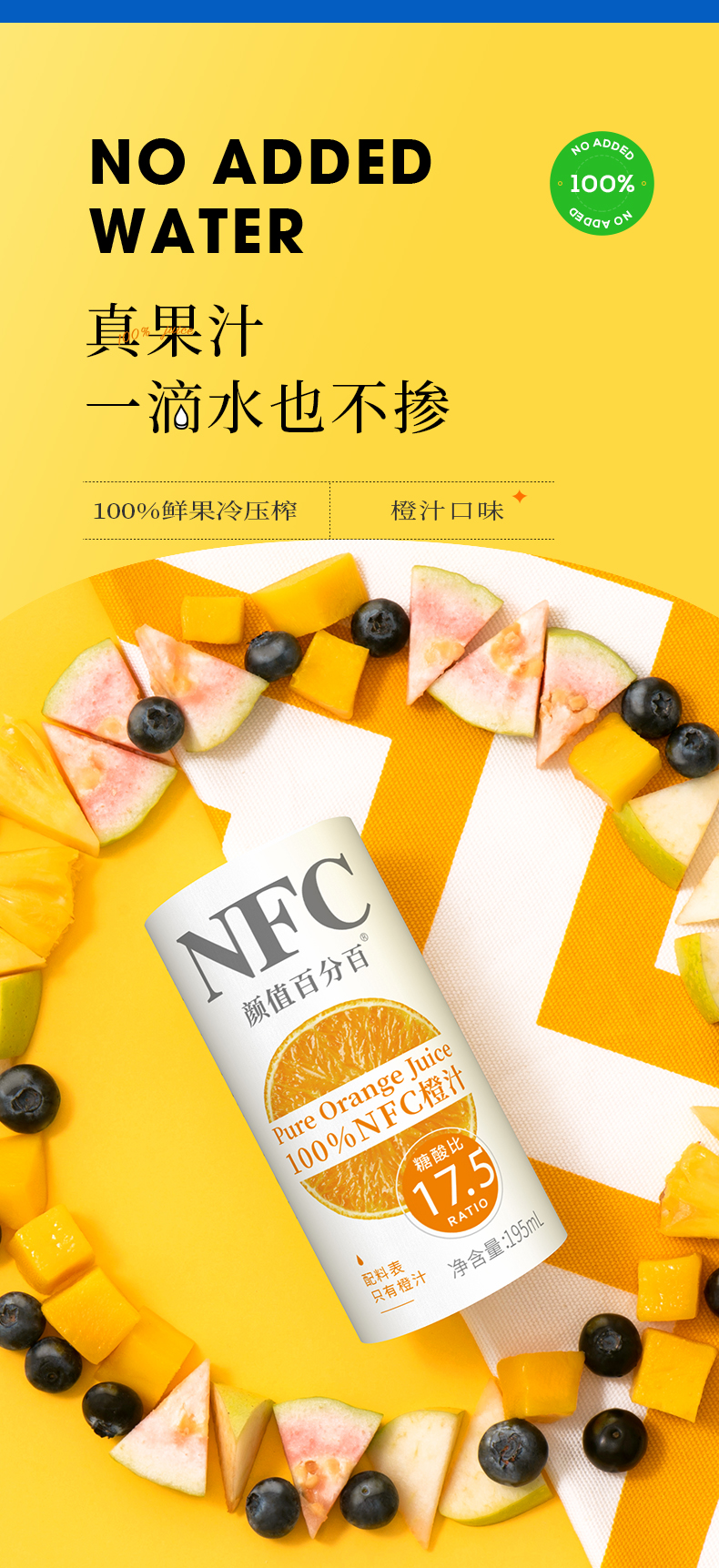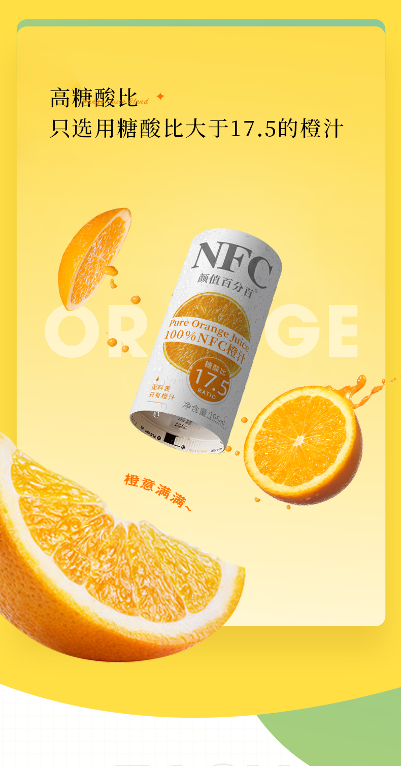 这款颜值 100%NFC 鲜果冷压榨橙汁,选用巴西鲜橙为原料然后低温冷榨,拒绝高温浓缩和兑水还原,生产过程中不加水、不加糖、不加防腐剂、香精、甜味剂这些添加剂。
