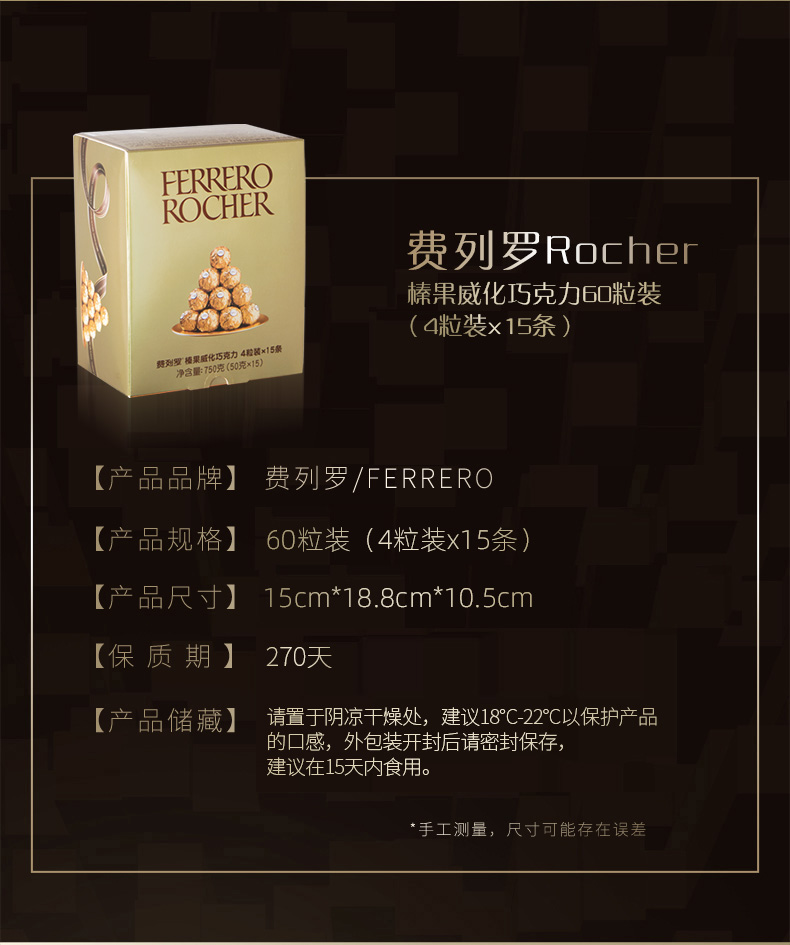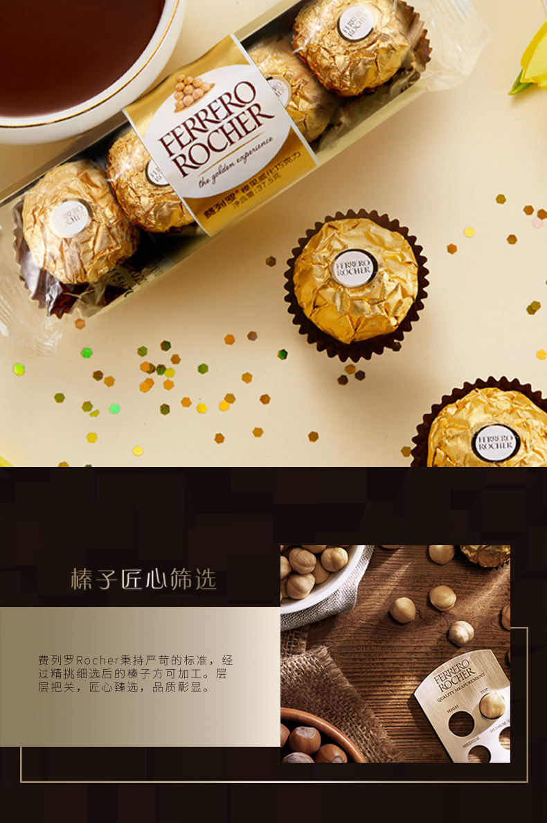 意大利费列罗Rocher是世界著名巧克力品牌,是国人比较热衷的巧克力产品。原创配方、精心制作、雅致包装和开创性的推广活动;新颖的形状 – 圆形却不规则 – 与金箔纸独立包装,让其尽显典雅华贵;独特风味呼之欲出:外层香浓巧克力,内有松脆威化及香滑榛果可可酱和原粒榛果,带来多种口感的享受。