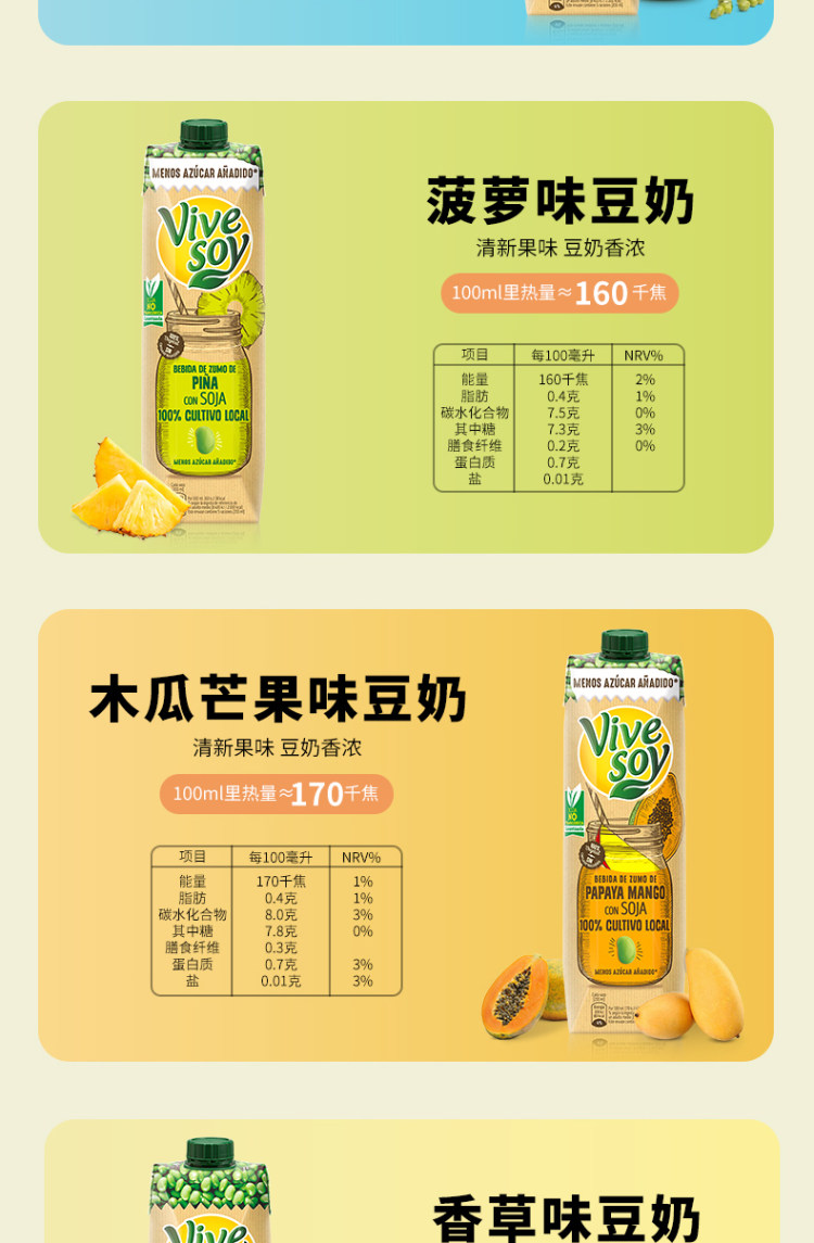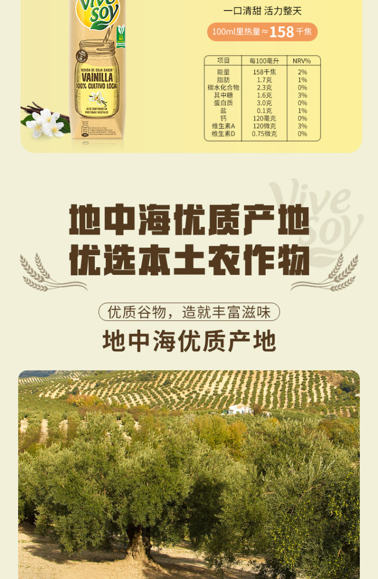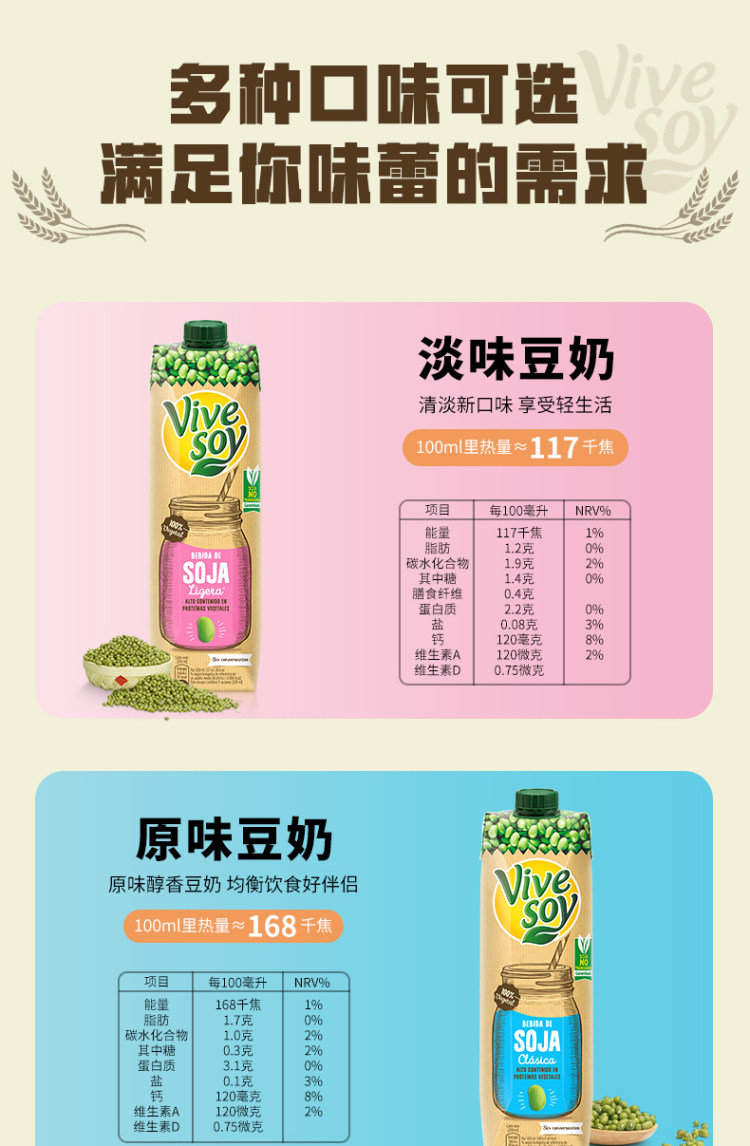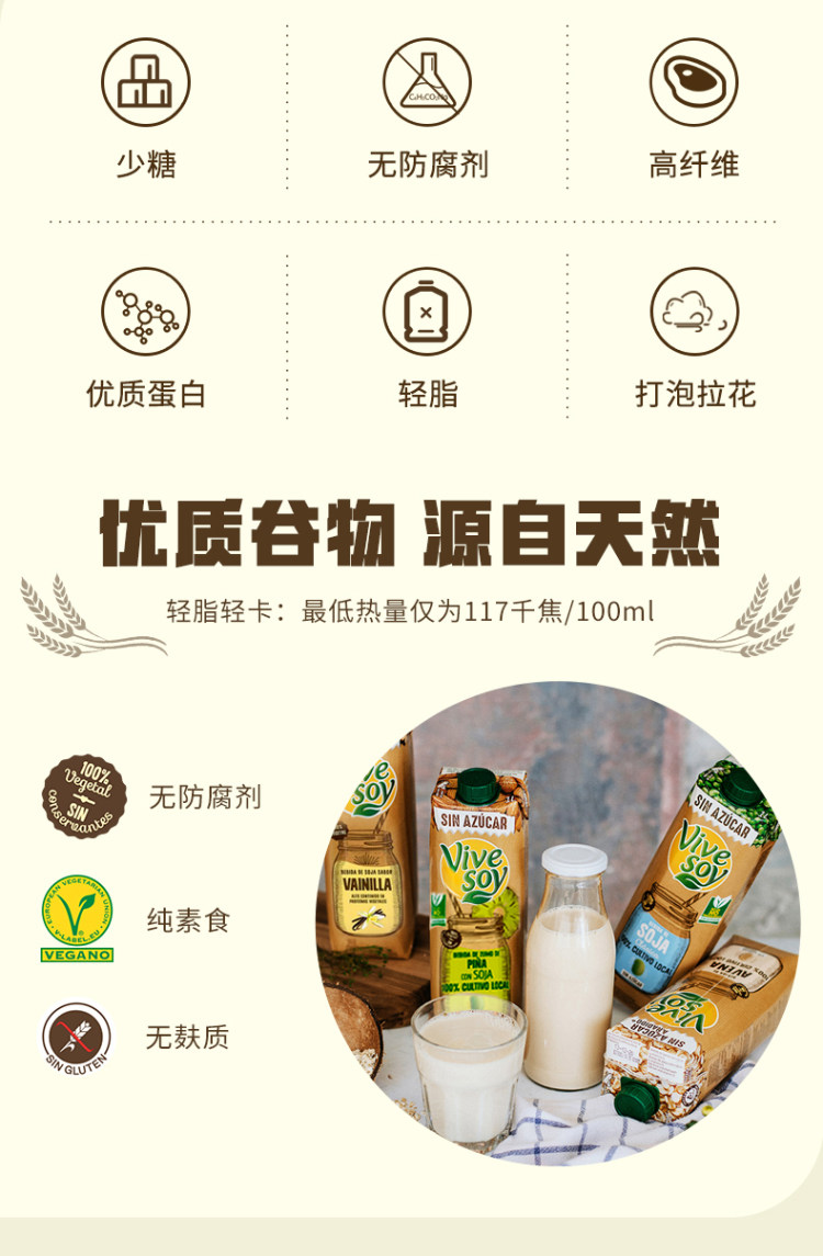 西班牙PASCUAL帕斯卡乳业集团在2003年创立了功能性产品品牌“ViveSoy”,主要生产豆浆、豆汁奶茶、大豆果汁和含大豆的谷粒麦片和面包等一系列豆制产品。这款Vivesoy 无糖植物奶 1L,选用西班牙非转基因植物原料,受欧盟管控,0动物脂肪、0乳糖、0胆固醇,天然低脂,一瓶仅含1.2g脂肪,富含丰富的谷物纤维,促进肠道蠕动,钙含量与牛奶媲美,另外含有多种维生素,无多余添加,营养健康。