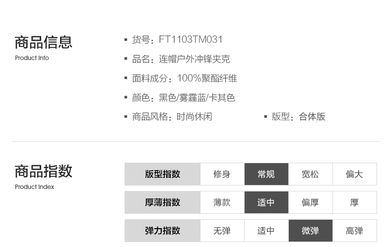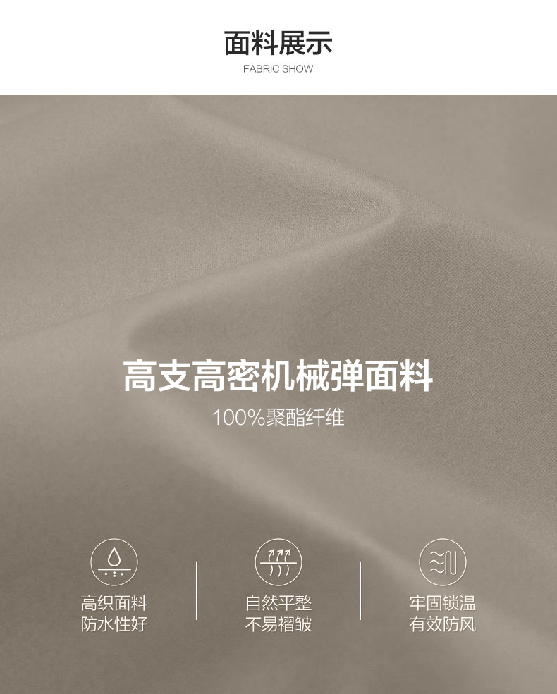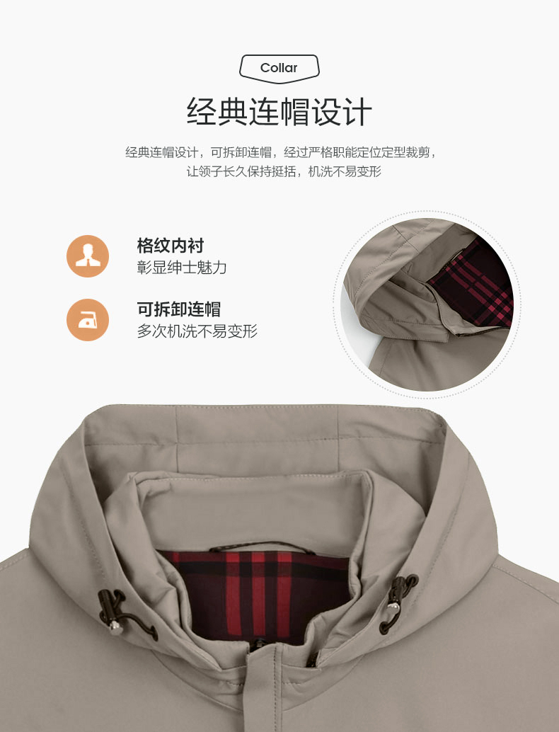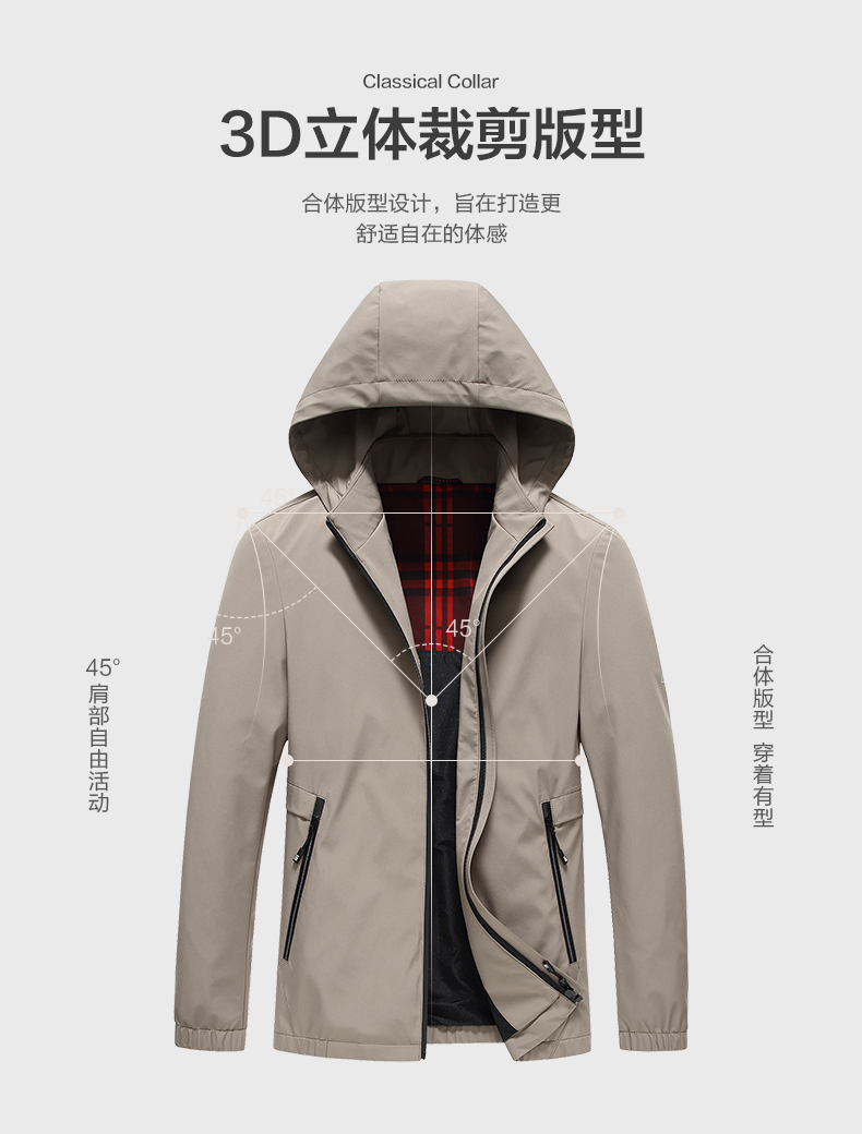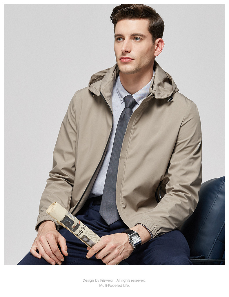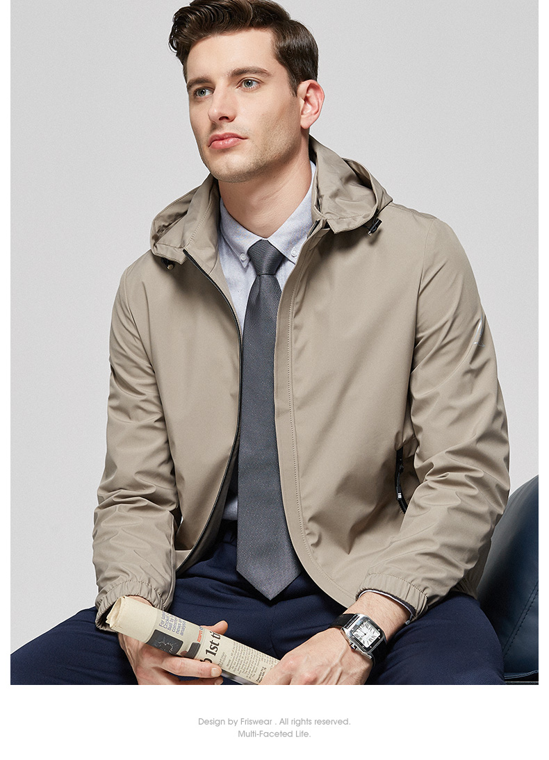 杉杉经典的领导夹克,高支高密的四面弹性面料,100%聚酯纤维,面料高织,有一定的防水性能,上身不易褶皱,同时也有一定的防风性,3D立体裁剪版型,上身舒适,穿着有型,可拆卸的连帽设计,商务休闲均可。
