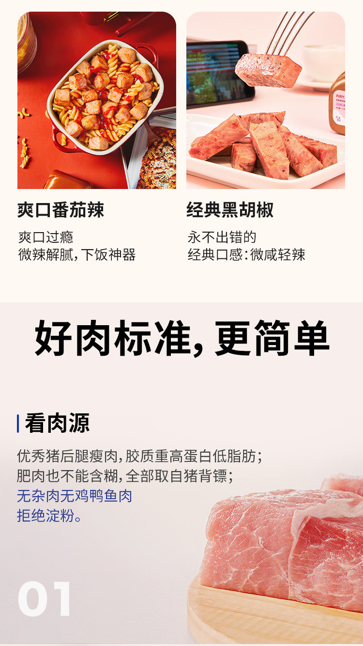 6项0添加,不做淀粉肉,只加低钠盐,,一场彻底的午餐肉的革命就是空口即食都好吃~可以放心的配方,六无一添加,不同吃法享受不同阶段的美味~领券链接点此