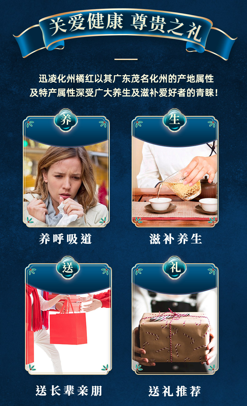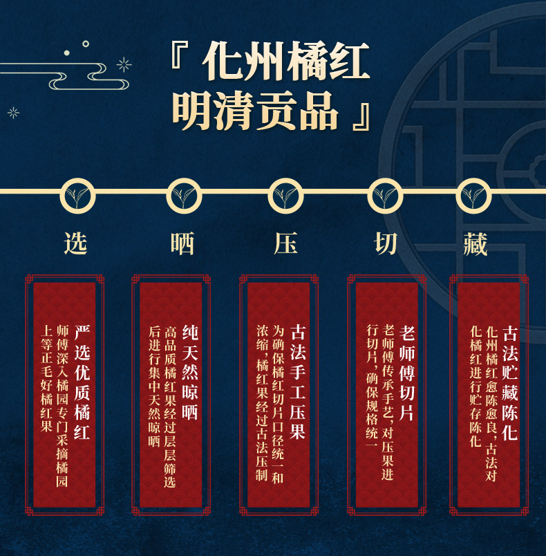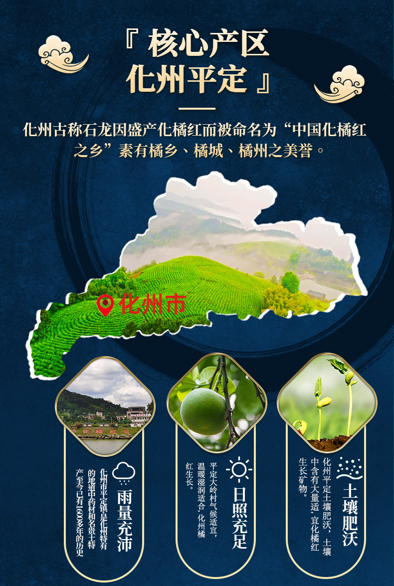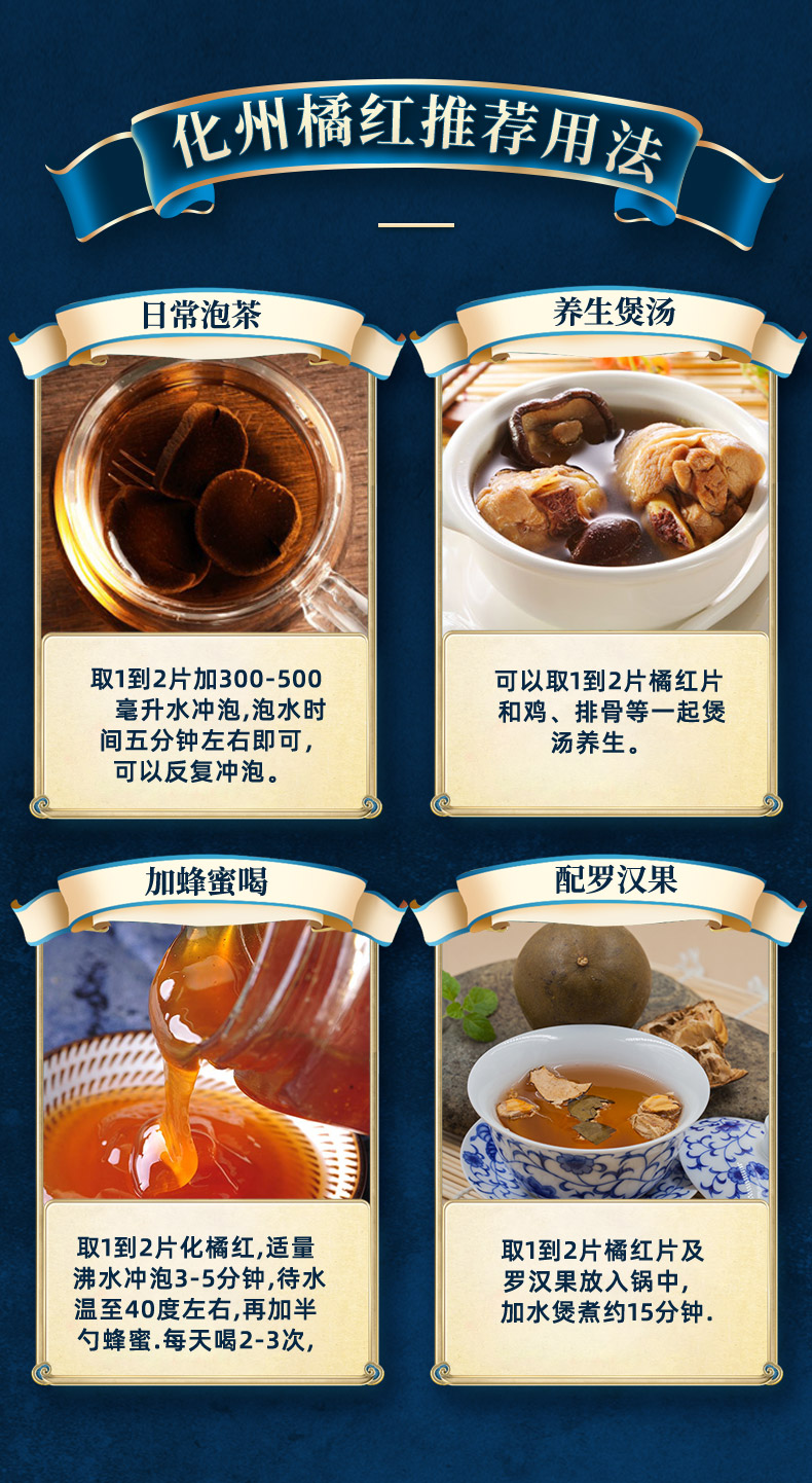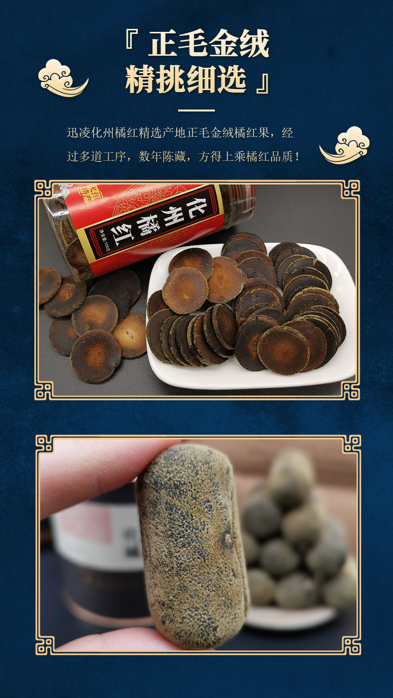 化州橘红为岭南十大药材之一,又称“南方人参”,有散寒燥湿,利气消疾,止咳、健脾消食等功效,长期饮用对支气管咽部的问题有很大的改善,可混合普洱茶冲泡。明清更是风靡全国,成为朝庭贡品,其制剂及工艺品曾红极一时,是“中国四大南药”和“十大广药”之一。
