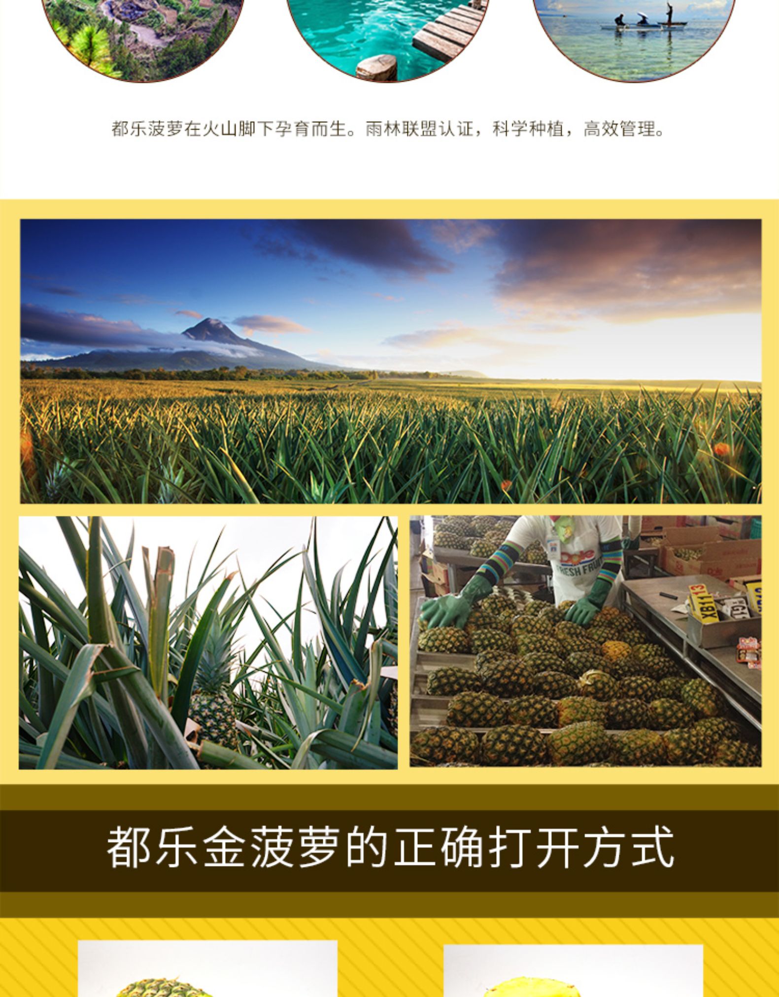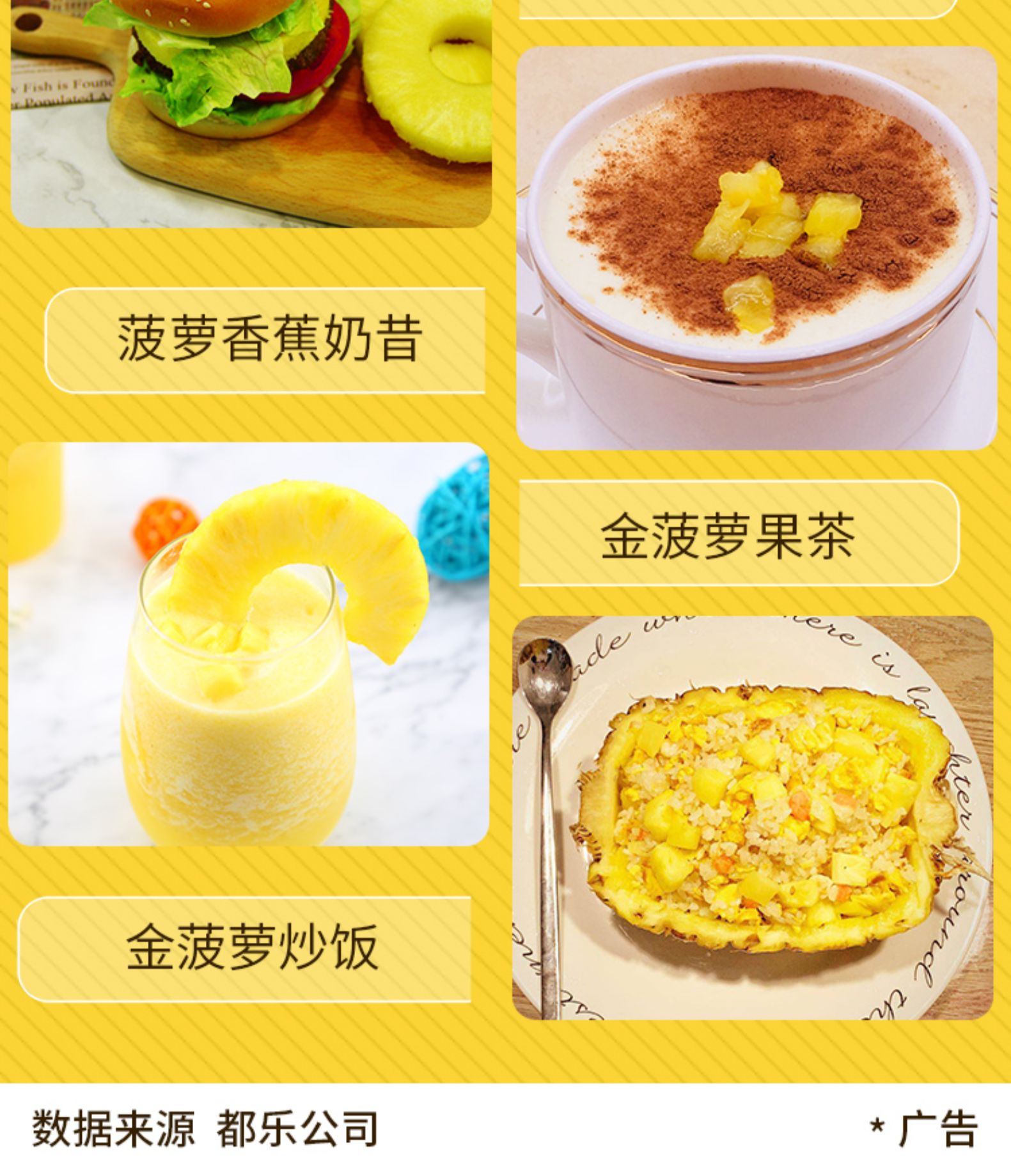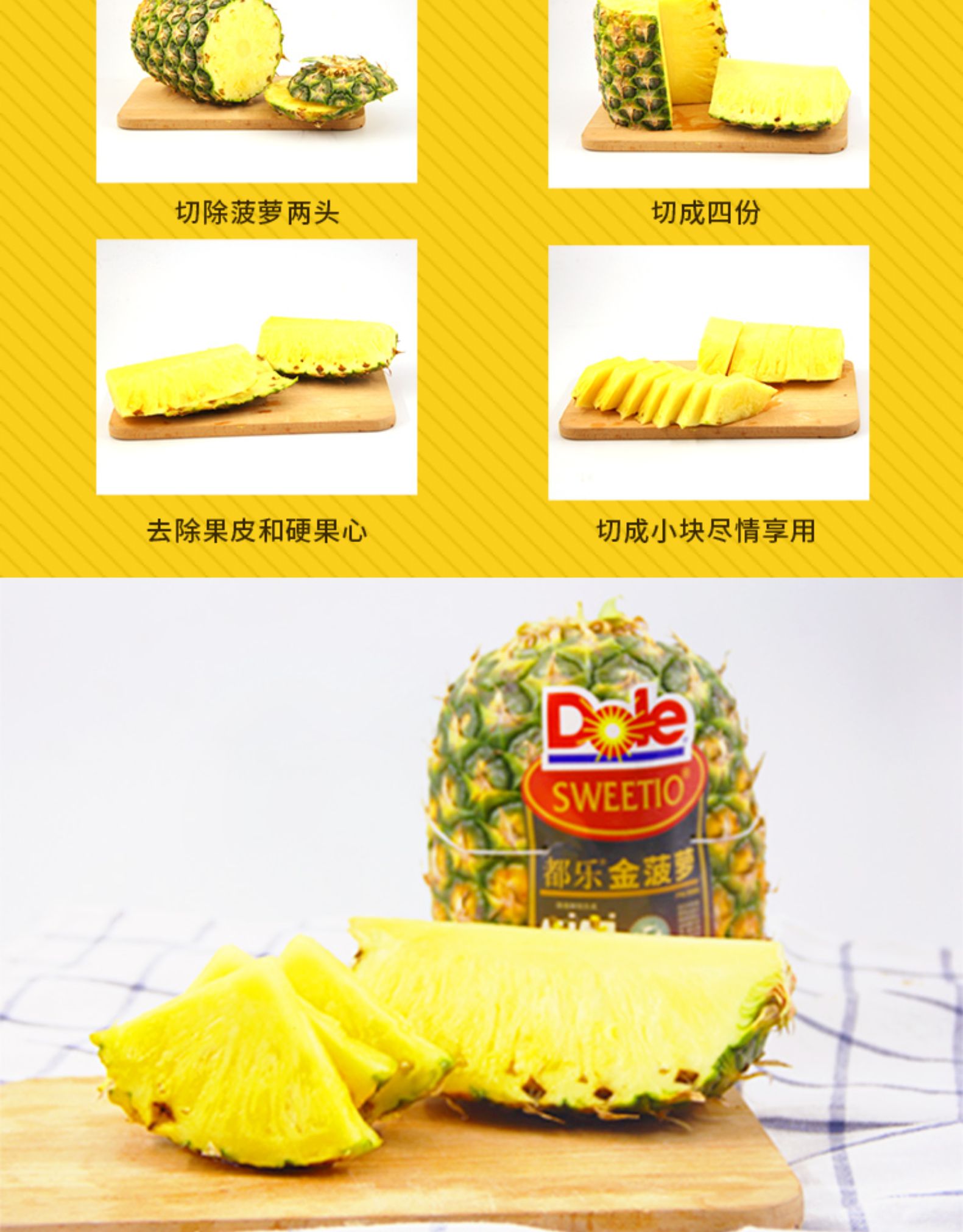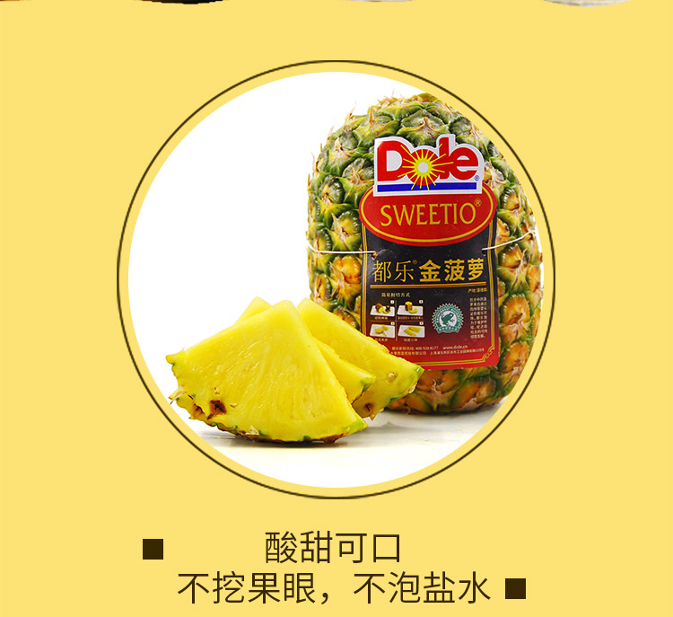 这款菲律宾都乐 无冠金菠萝,无需浸泡即可食用。外形很漂亮,果肉色黄,质爽脆,纤维少,酸甜适口,果肉细腻。营养极为丰富,果肉中含有还原糖、蔗糖、蛋白质、粗纤维和有机酸、维生素C、胡萝卜素、硫胺素、尼克酸等。