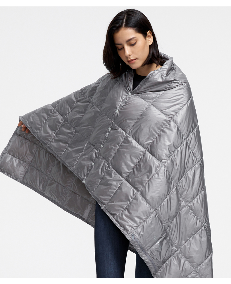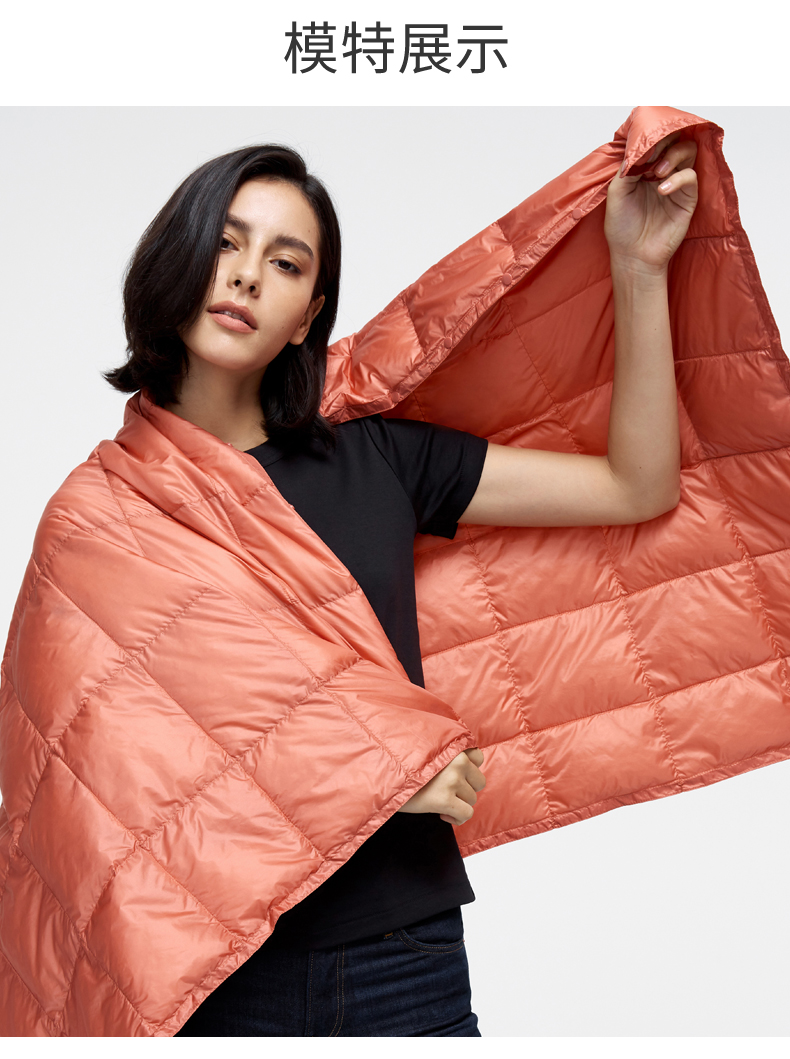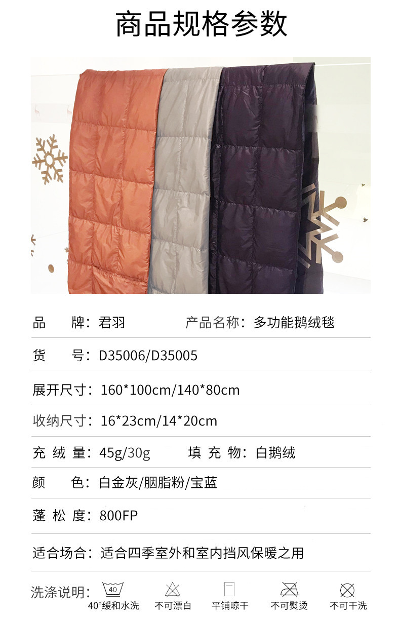 这款君羽羽绒毯,内里填充了800蓬90%鹅绒,充绒量为45克,可以轻易收纳成小手袋形状,尺寸是16*23cm,仅重0.19kg,非常便于携带。展开后是的尺寸是160*100cm,可以作为披肩毯、午休小憩盖毯、盖腿毯。