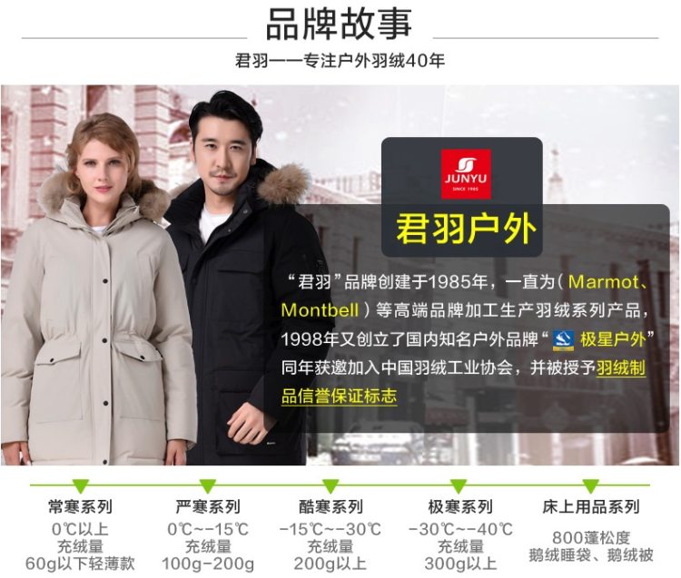 君羽创立于1985年,一直为Marmot/土拨鼠、日本Mont-bell等户外大牌代工羽绒服。“君羽”与“极星户外”都是旗下自有品牌,其中“君羽”定位时装,“极星”定位户外服装。极星拥有8000米以上高海拔,和极地羽绒服、羽绒睡袋产品线,曾是中国南极科考队、中国珠峰重测高度队的装备。