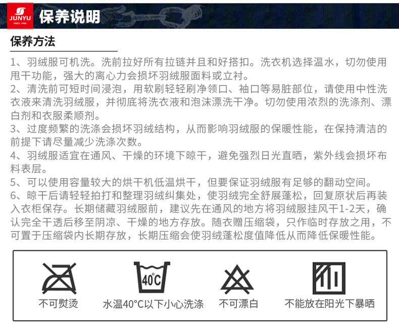 外层面料上,使用高密度锦纶面料,耐磨、防风、防泼水、防钻绒,能保持面料表面长期干爽、洁净。羽绒采用先车出羽绒隔舱后充绒的方式,缩绒针细针眼搭配粗线的防钻绒工艺。