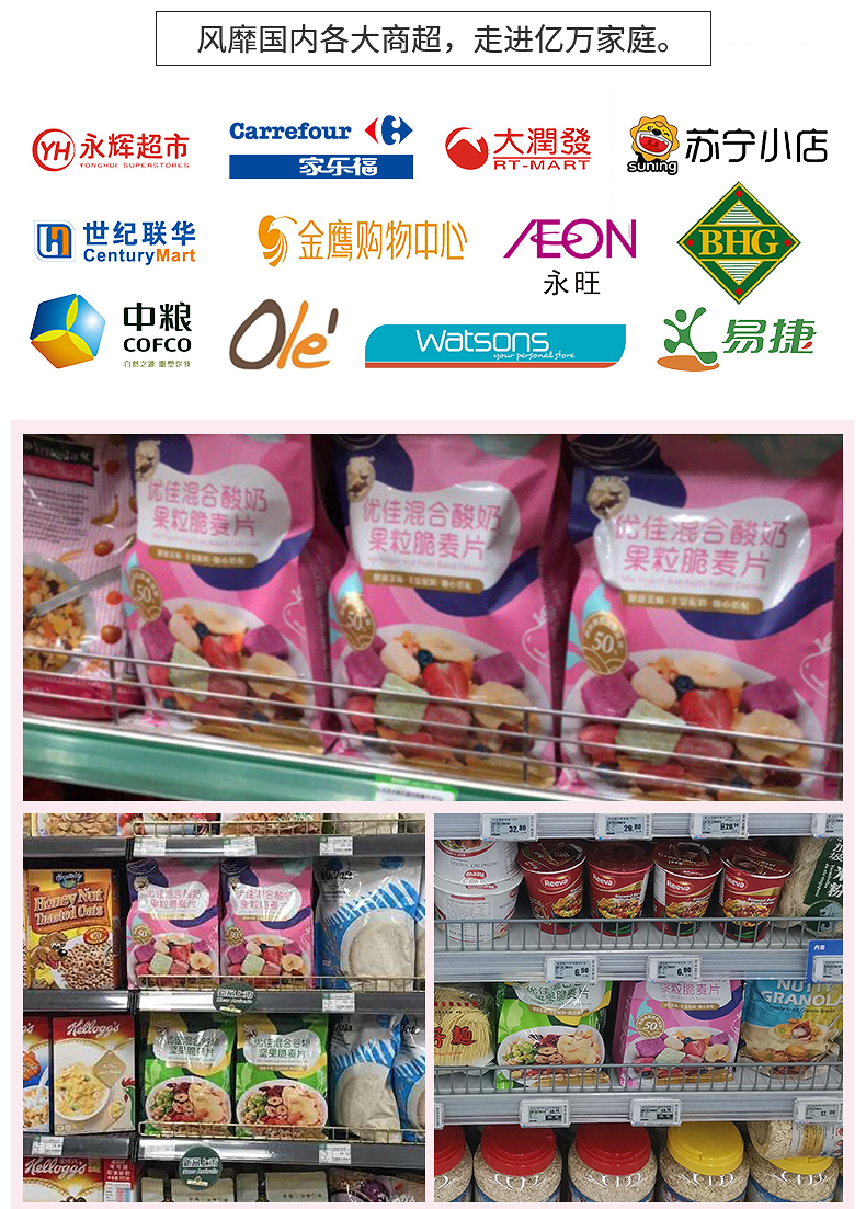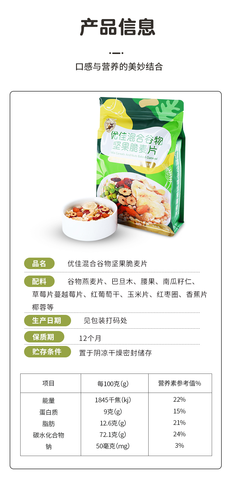 这款优佳 即食混合谷物坚果脆麦片,水果谷物搭配配方,使用非膨化麦片为主料,富含膳食纤维易饱腹,搭配腰果、枸杞、香蕉片、玉米片、烤椰片、葡萄干、冻干草莓、蔓越莓干、红枣、南瓜籽仁、巴旦木,不额外添加蔗糖,营养均衡,不含人工添加剂,适合健身代餐。