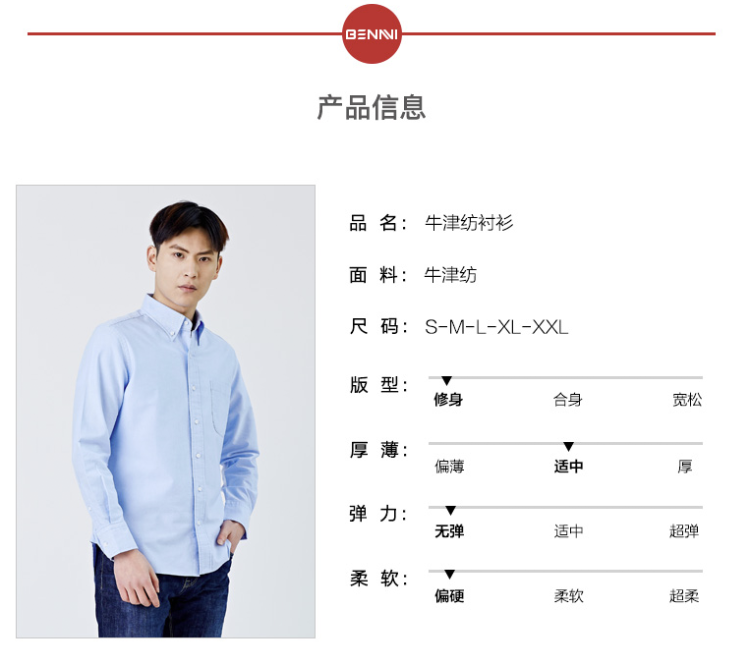 本米牛津纺衬衫,面料选用新疆长绒棉,先染色后织成面料,色泽均匀不易褪色,织成面料后拥有牛津纺的厚粗,又比较柔软亲肤。略收腰的合体版型,比直筒显瘦,细节上,选用劳拉衬布(西装、衬衫的大牌衬布),英国高士缝纫线,经典美式衬衣7cm长领尖,领角有纽扣以保持领形,分裁式后背,防止后领起鼓。