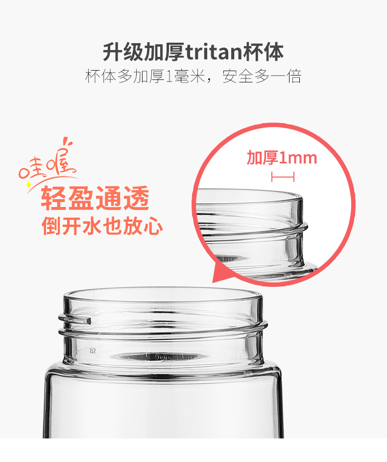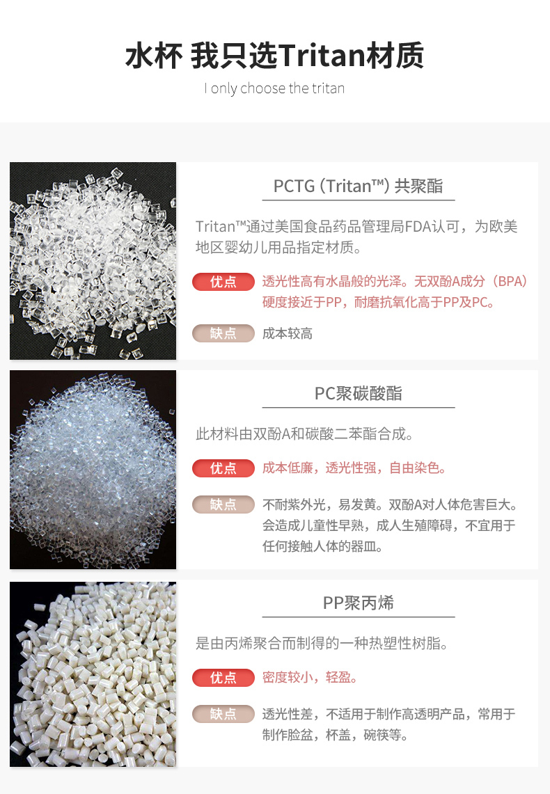 新一代共聚酯Tritan是欧美地区婴儿奶瓶的专用材料,不含双酚A和BPA成分,在使用过程中也不会释放,符合环保要求及 FDA。是一种非常安全健康的材质。而且Tritan透光率>90%,雾度<1%,有水晶般的光泽。有优异的抗冲击强度。能抗洗涤剂、清洁剂、烃类溶剂、油类、香水等腐蚀;在湿热的环境中能抗水解。