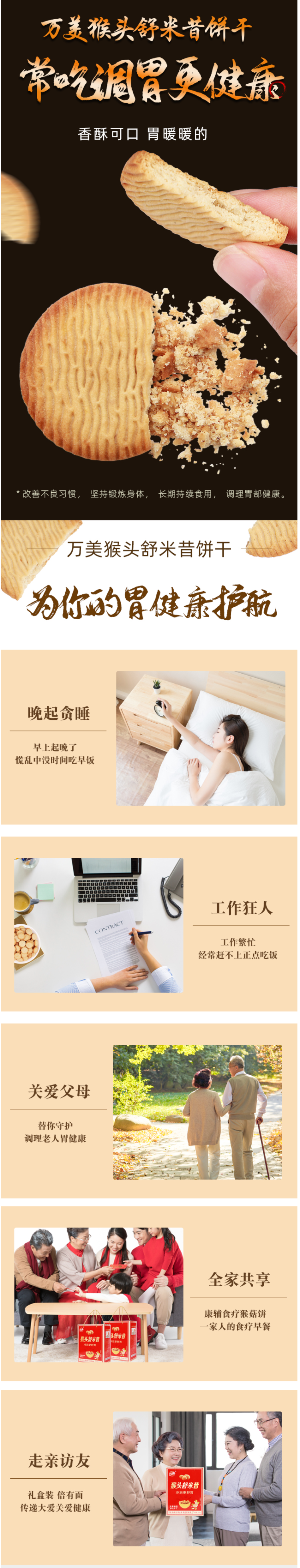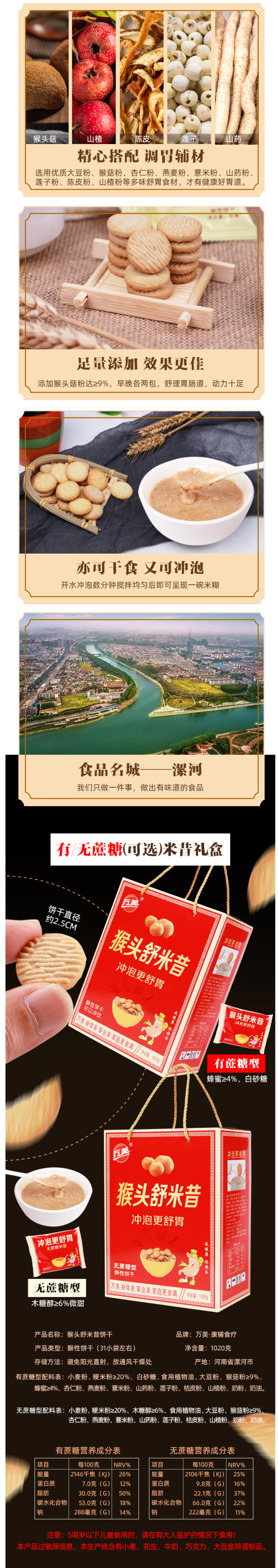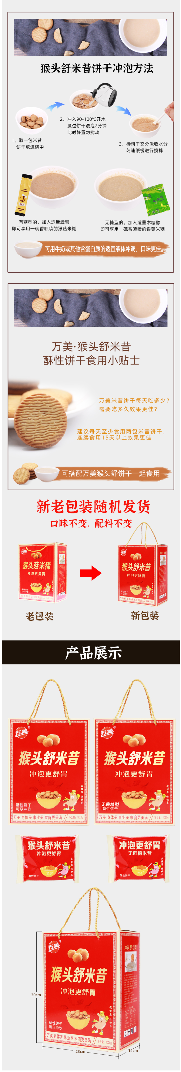 这款猴菇米稀饼干,精选燕麦、粳米、薏米、莲子、山药、桔皮、山楂、奶粉、奶油等等,精细烘焙而成,入口香酥,营养丰富。吃法多样,开水冲泡以后就是美味的猴姑米稀。独立小袋包装方便携带。