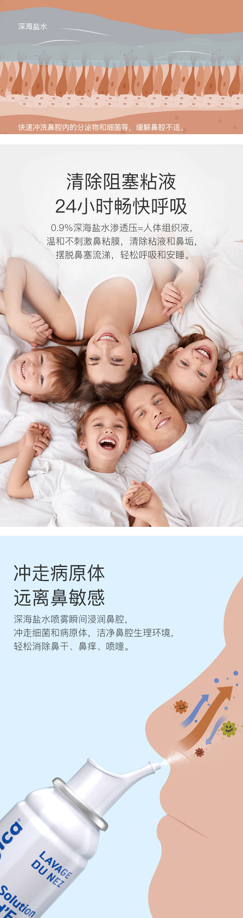 采用法国天使湾深海900m纯净海盐水提炼而成,0污染0细菌,富含多种有益元素,有利于修复鼻粘膜;经过16工序,层层过滤杀菌,达到医用级别的无菌纯净水,可缓解鼻干燥、鼻出血、鼻塞、鼻痒、流涕等鼻腔不适症状,对于鼻炎患者,有很好的效果,适合3岁以上的儿童和成人使用。