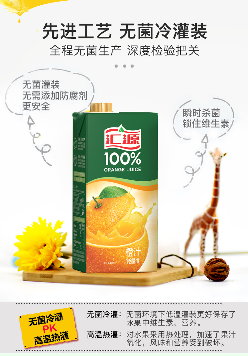 采用无菌冷罐装技术,经过UHT瞬时杀菌,以25℃的冷罐装,更好的保留了果汁的营养、色泽和美味。外包装采用具有阻氧、避光、密封性能强的纸、铝、塑等7层复合无菌包装,有效阻挡阳光,避免果汁氧化。