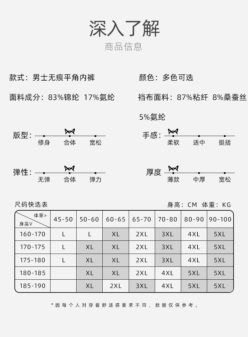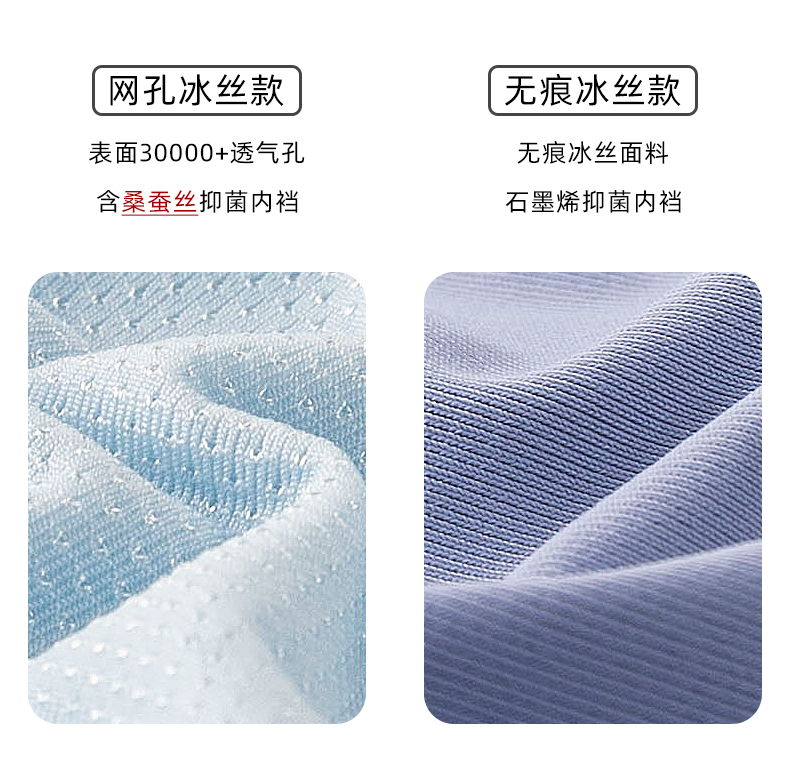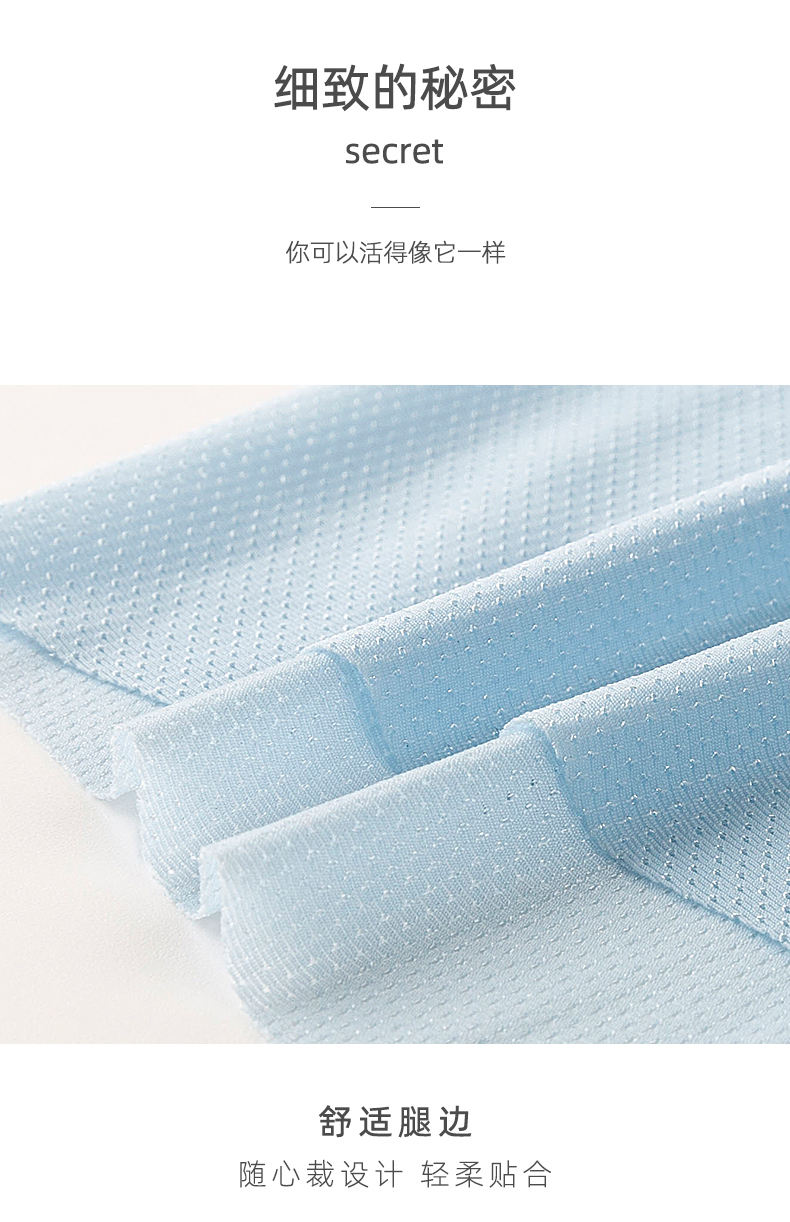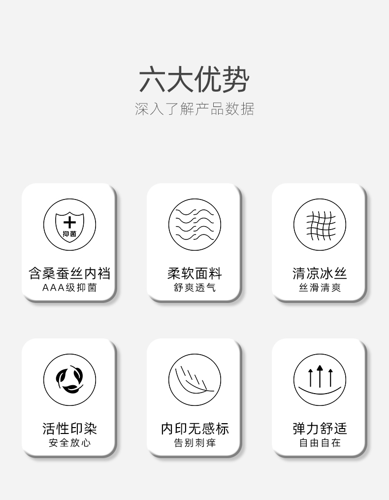 优选冰丝面料,一片式无痕,亲肤柔软,吸湿透气,AAA级抑菌内裆,速干舒爽,活性印染,安全放心,告别刺痒,弹力舒适,自由自在!