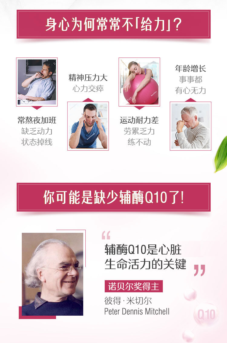 辅酶Q10又名泛醌,广泛存在于人体组织器官。Q10堪称心保健领域最伟大的发现之一,普遍存在人体细胞中,尤其是心脏中含量最高,辅酶Q10可强化心脏机能,缓解缺氧状况,因此称为“心脏活力之源”。可用于日常心脏的保健,抵御疲劳,抵抗衰老,改善胃溃疡、冠心病等疾病的辅助治疗。