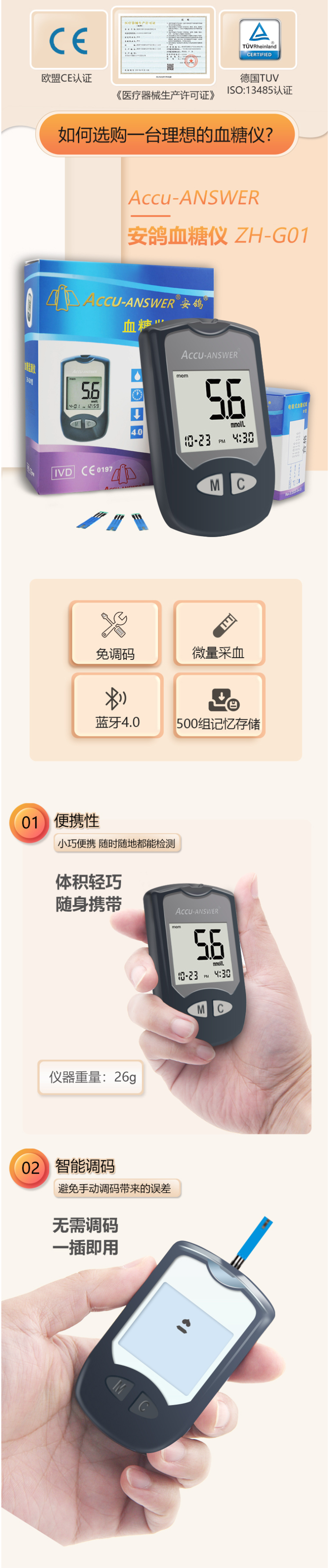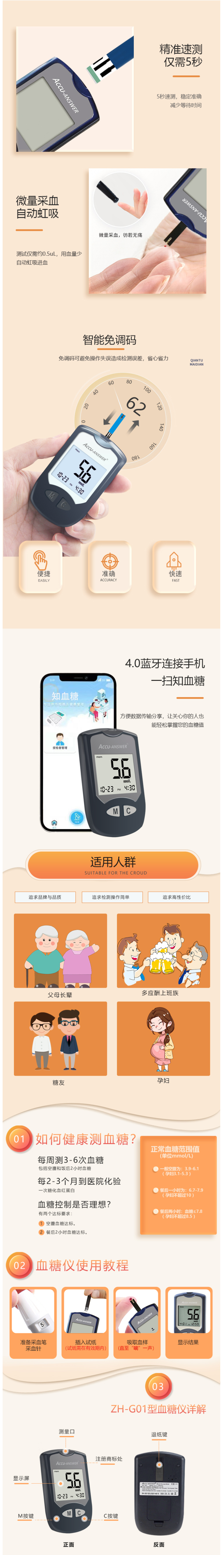 这款安鸽血糖仪,急速测量5s出结果,无需等待;插条自动开机,智能免调码,无需手动设置,可明显减少测量误差,一键轻松退条。0.5μL微量采血,痛感微弱。