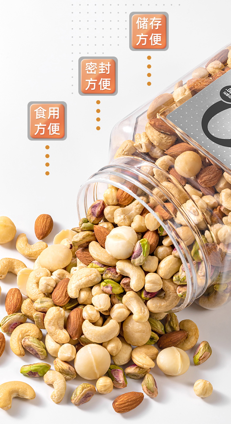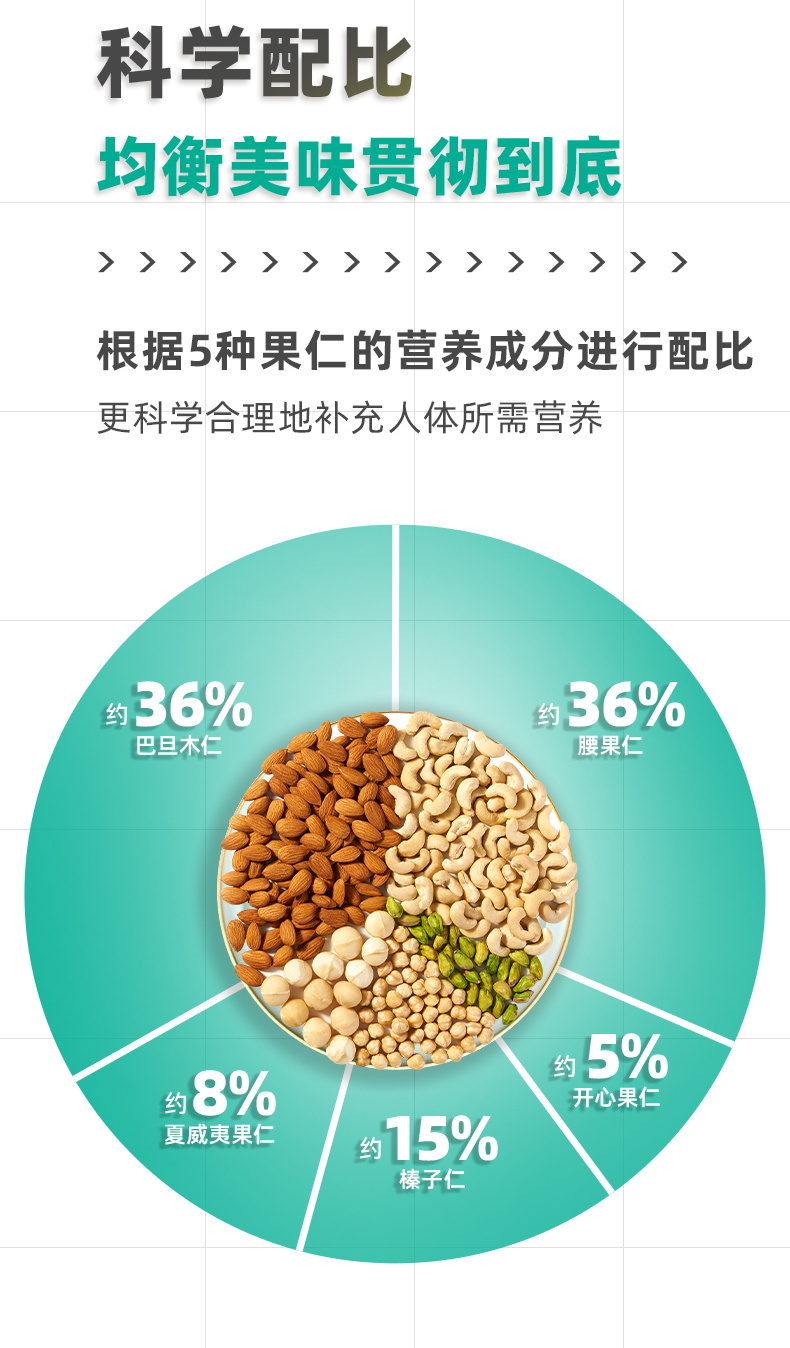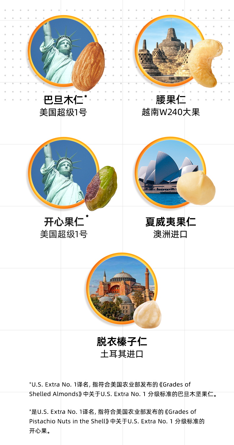 五种混合坚果包含:美国超级1号巴旦木、越南W240腰果仁、美国超级1号开心果仁、澳洲夏威夷果仁、土耳其脱衣榛子仁。