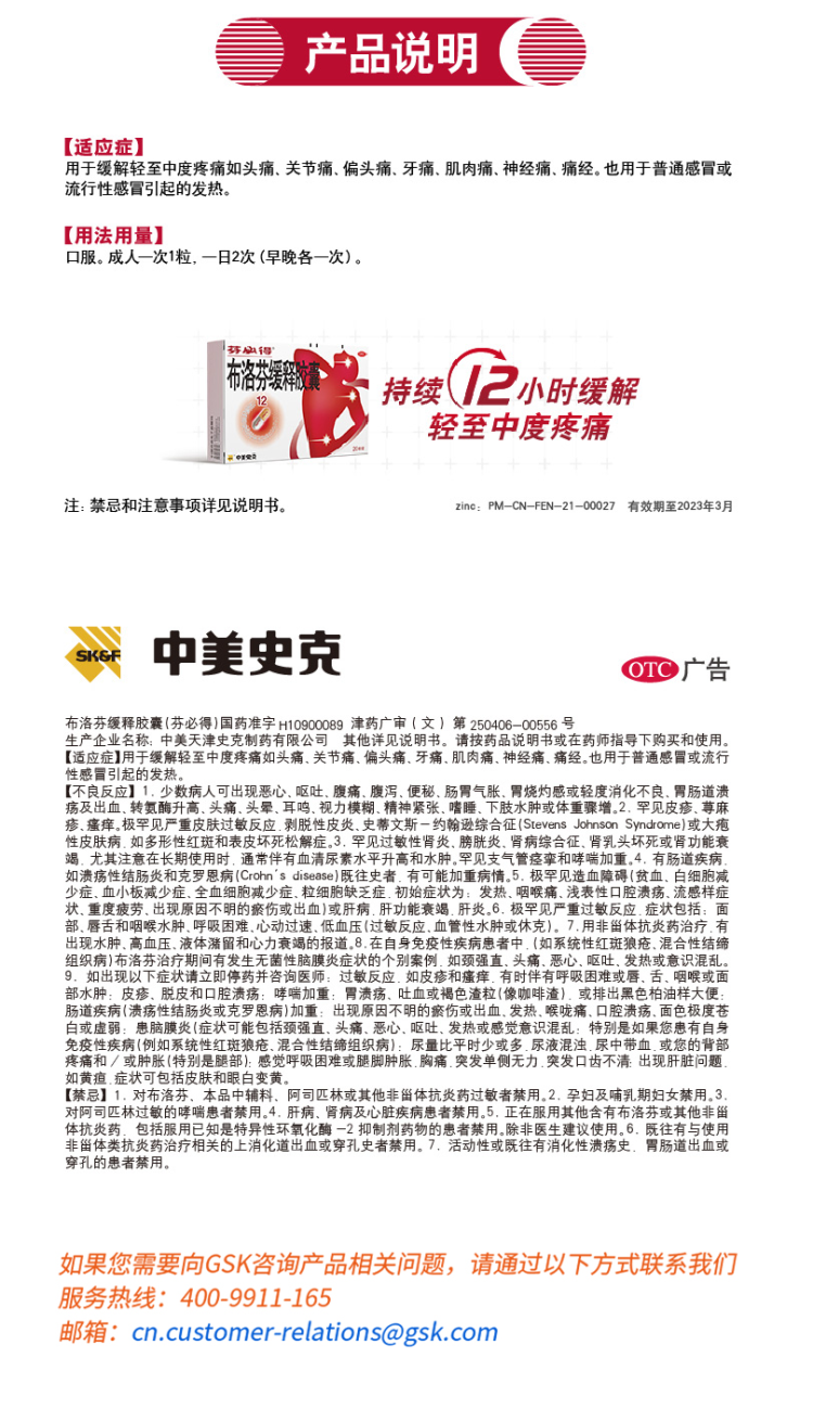 布洛芬是著名的非处方止疼药,含对乙酰氨基酚和咖啡因,对于头疼、关节疼、肌肉疼、牙疼等各类疼痛都有缓解作用,也适用于普通感冒或流行性感冒引起的发热,是家中常备药。1粒可管12小时。