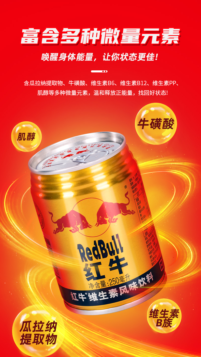 泰国天丝医药保健有限公司授权,redbull红牛旗舰店旗舰店直发,品质可靠。Red Bull 红牛是全球首先推出且被人熟知的的能量饮品之一。内含水、糖、咖啡因、muco-纤维醇和维生素B等成分的“滋补性饮料”,特别添加西洋参提取物,补气益脑,提神抗疲劳,熬夜加班、长途驾驶、运动健身补充能量。
