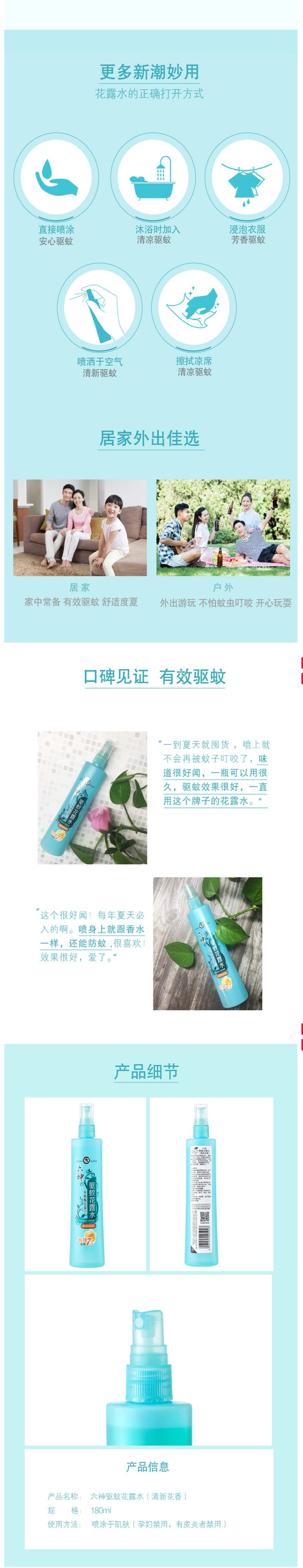 含薄荷醇+金银花和4.5%驱蚊酯,远离蚊虫困扰,能有效驱蚊7小时。同时防痱祛痱、清凉舒爽、清新醒脑,清新花香,恬淡宜人。