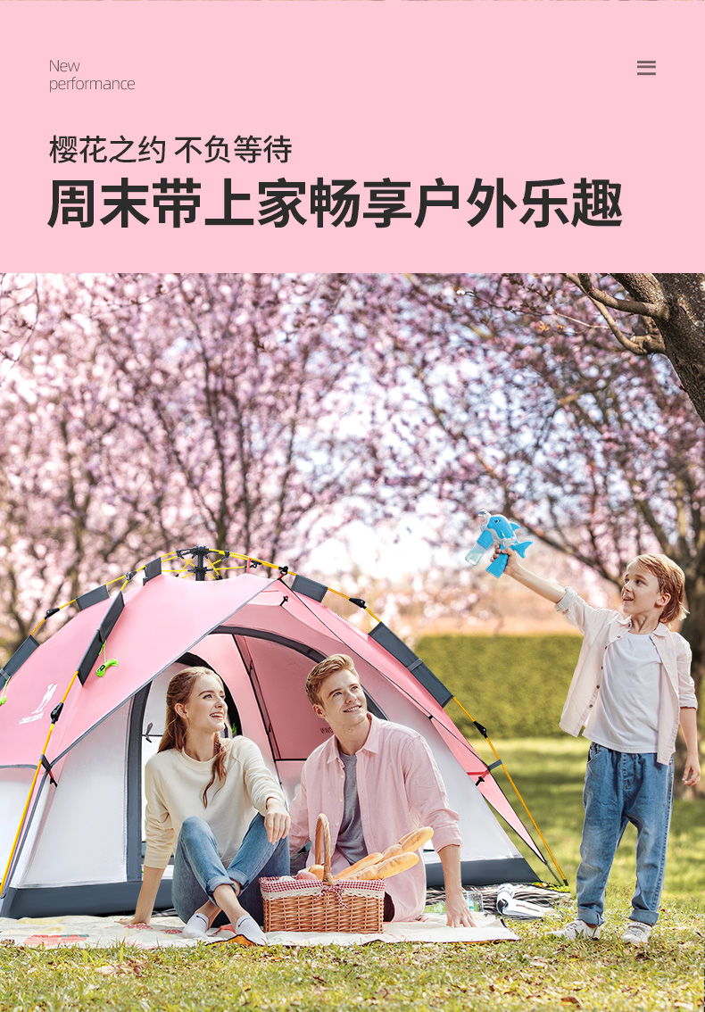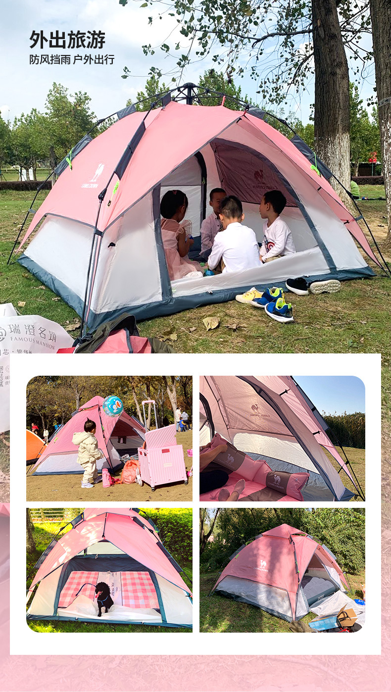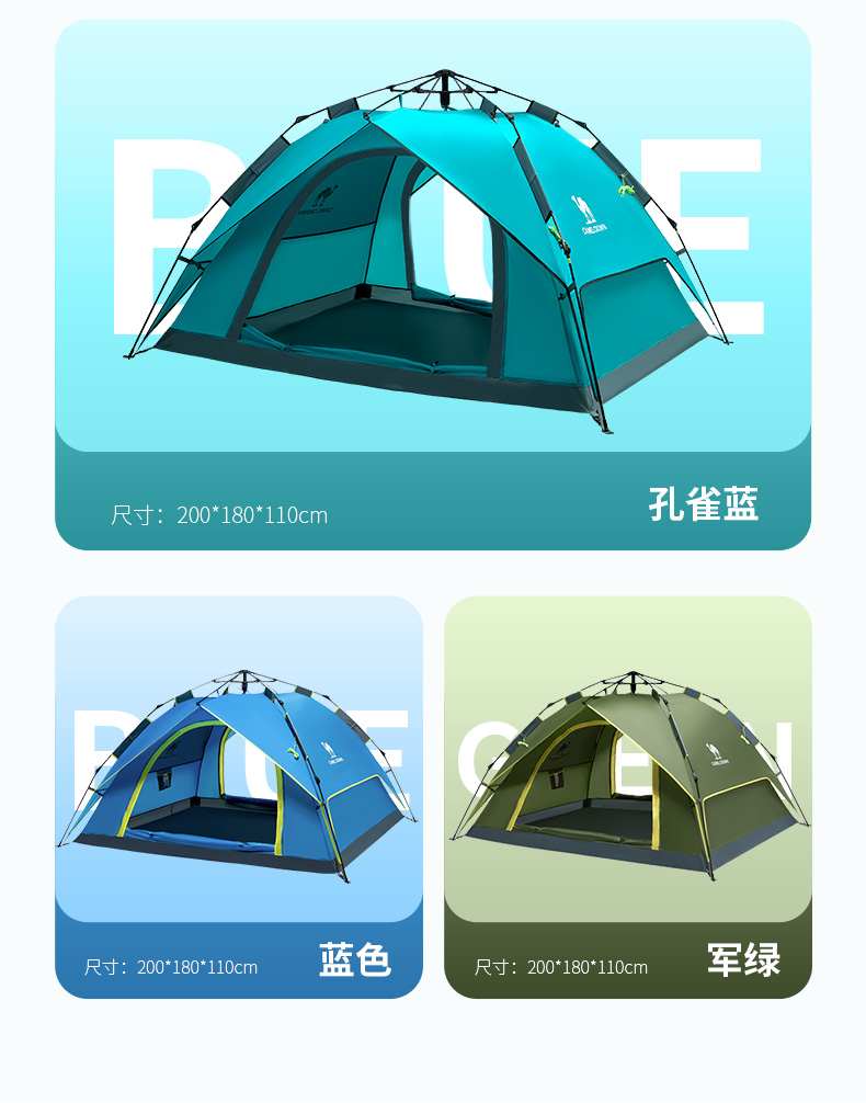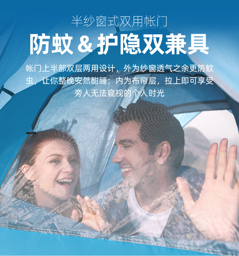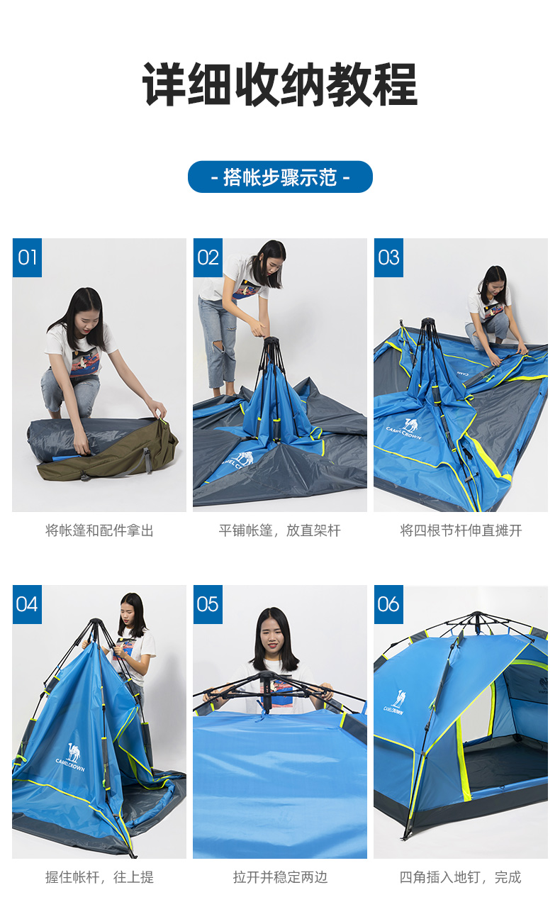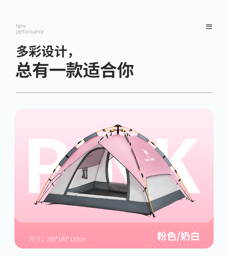 骆驼户外帐篷,全新升级支架,8.5MM玻纤杆弹压自动支架,易开易收质轻更牢固,两面网纱,晴雨通用,防雨又防晒,立体大空间可容纳4-5人,帐门上半部双层两用设计,外为纱窗透气之余更防蚊虫让你整晚安然酣睡,内为布帘层,拉上即可享受旁人无法窥视的个人时光,户外出游、露营必备装备。