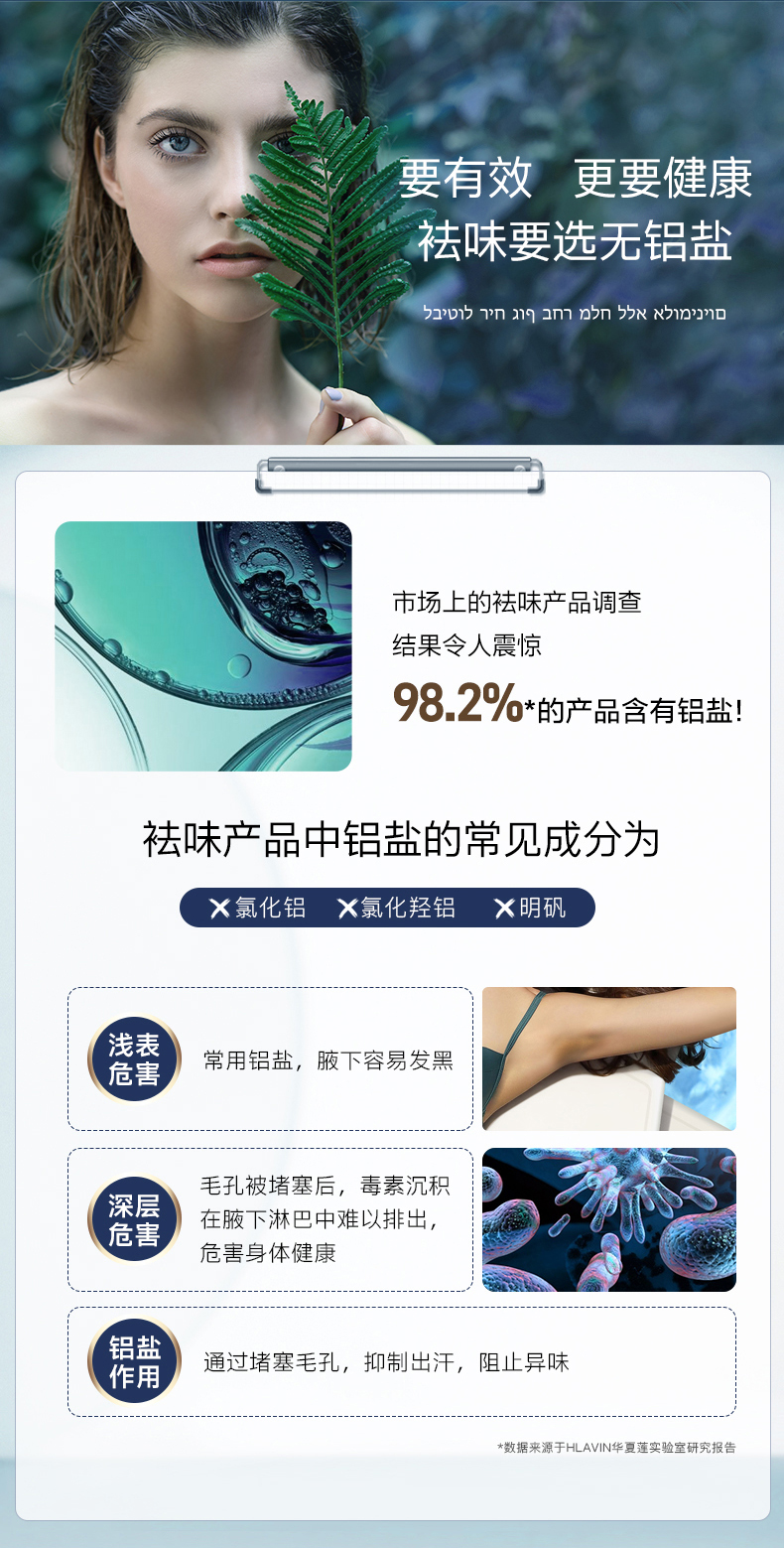 不含铝盐、酒精、尼铂金成分,相比市面98.2%含铝盐产品,不会导致腋下发黑,不会堵塞毛孔、不会抑制出汗、导致毒素沉积而危害身体健康。适用于包括孕妇、儿童、先天狐臭、汗臭等所有人群。