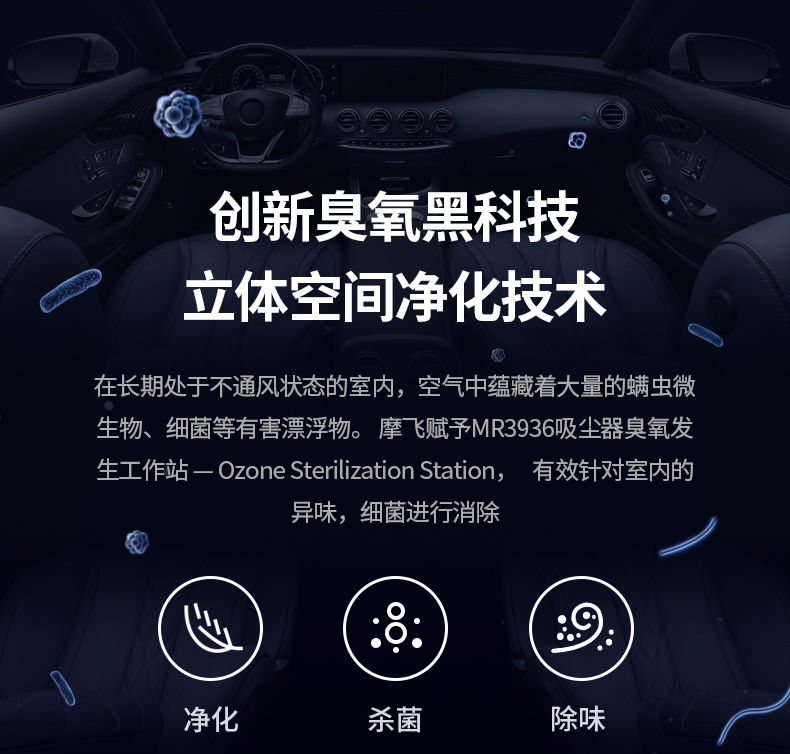 英国摩飞 车家两用 吸尘器,即是吸尘器也是环境的净化器。搭載摩直流核心电机-Morphy DC motor pro。电机转速升至38000转/分狆,提供高达5500Pa的吸力。搭配涡轮增圧风叶,再细微的灰尘也无所遁形。还拥有普通便携吸尘器所不具备的臭氧净化功能(MR3936吸尘器臭氧发生工作站一Ozone Sterilization Station),有效针对空气种异味、细菌、有害漂浮物的去除。