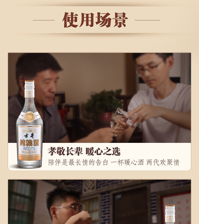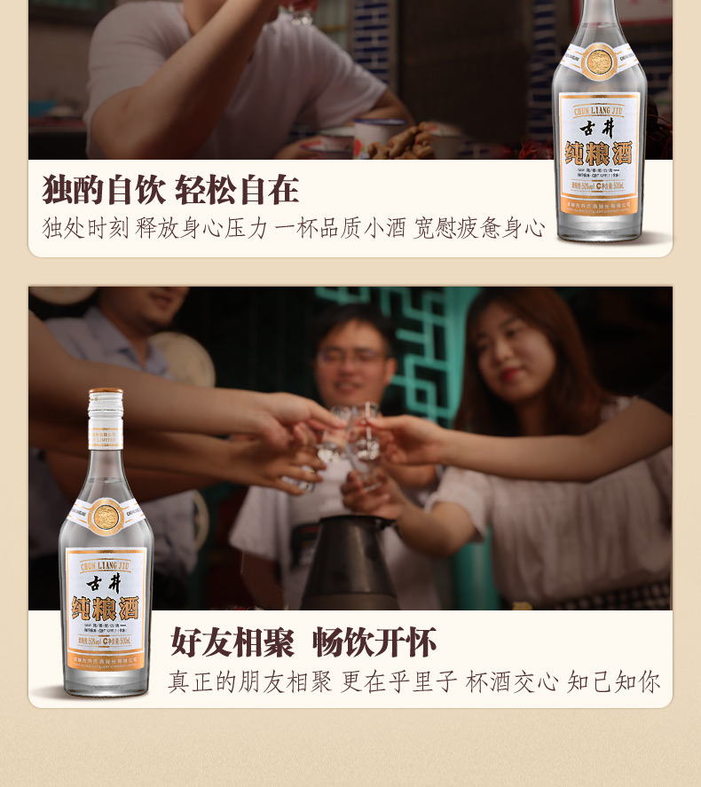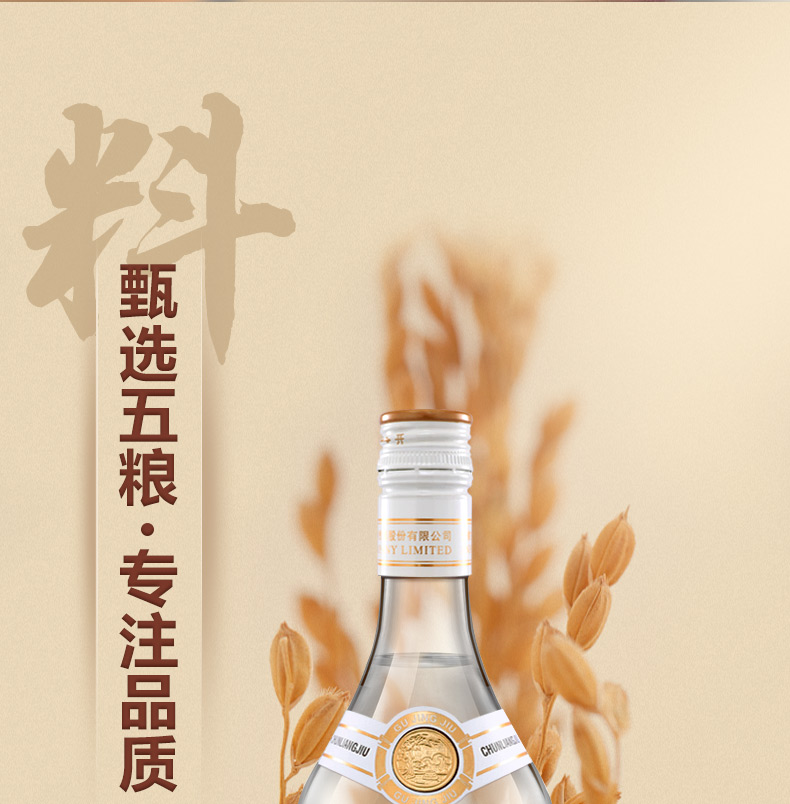 以高粱、大米、小麦、糯米、玉米五粮为原料。酒精度:50%vol,酒体醇厚口感丰盈;酒花绵密,余味悠长;酒线莹润,清澈透明。玻璃瓶精简低调更立体,更古拙,送人自用都不错。