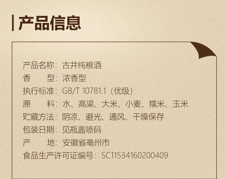 古井贡 新品光瓶 纯粮白酒,属于浓香型固态法白酒,执行标准采用GB/T 10781.1属于国家标准优级。