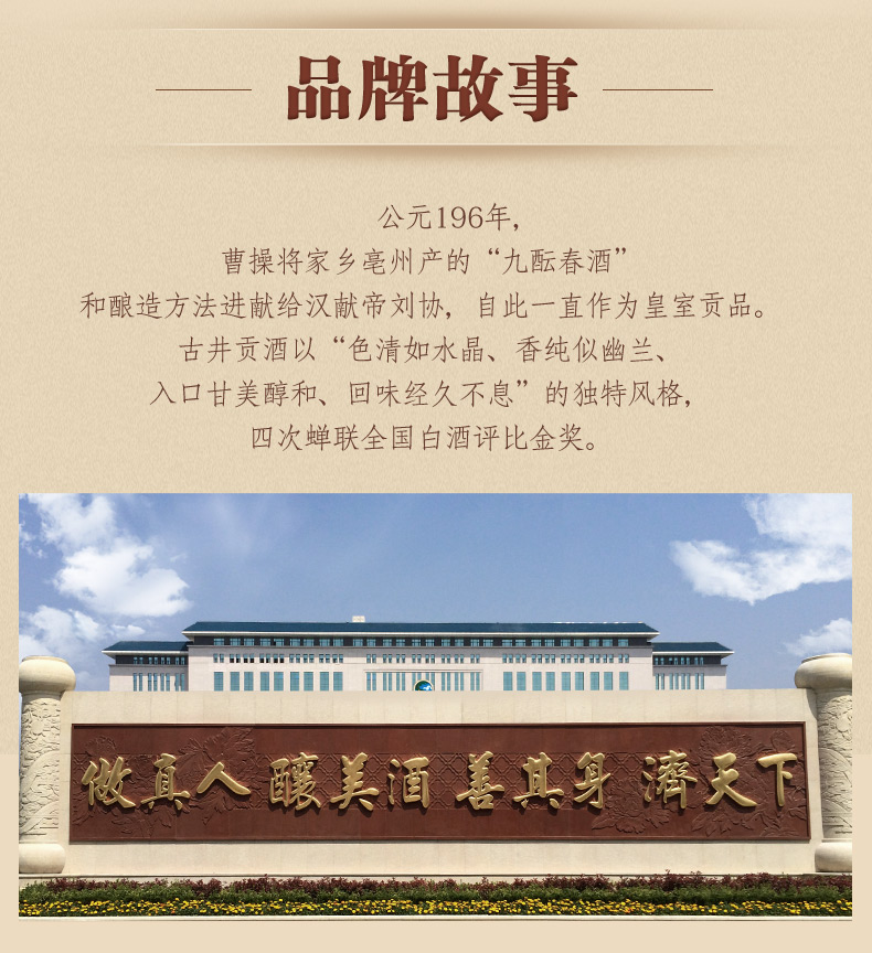 古井贡酒是亳州传统名酒。产自安徽省亳州市,属于亳州地区特产的大曲浓香型白酒,有“酒中牡丹”之称、被称为中国八大名酒之一,在全国第2届评酒会上获得第2名,这届评酒会是全场盲评,也是茅台酒唯一一次跌下神坛,获得了第5名。