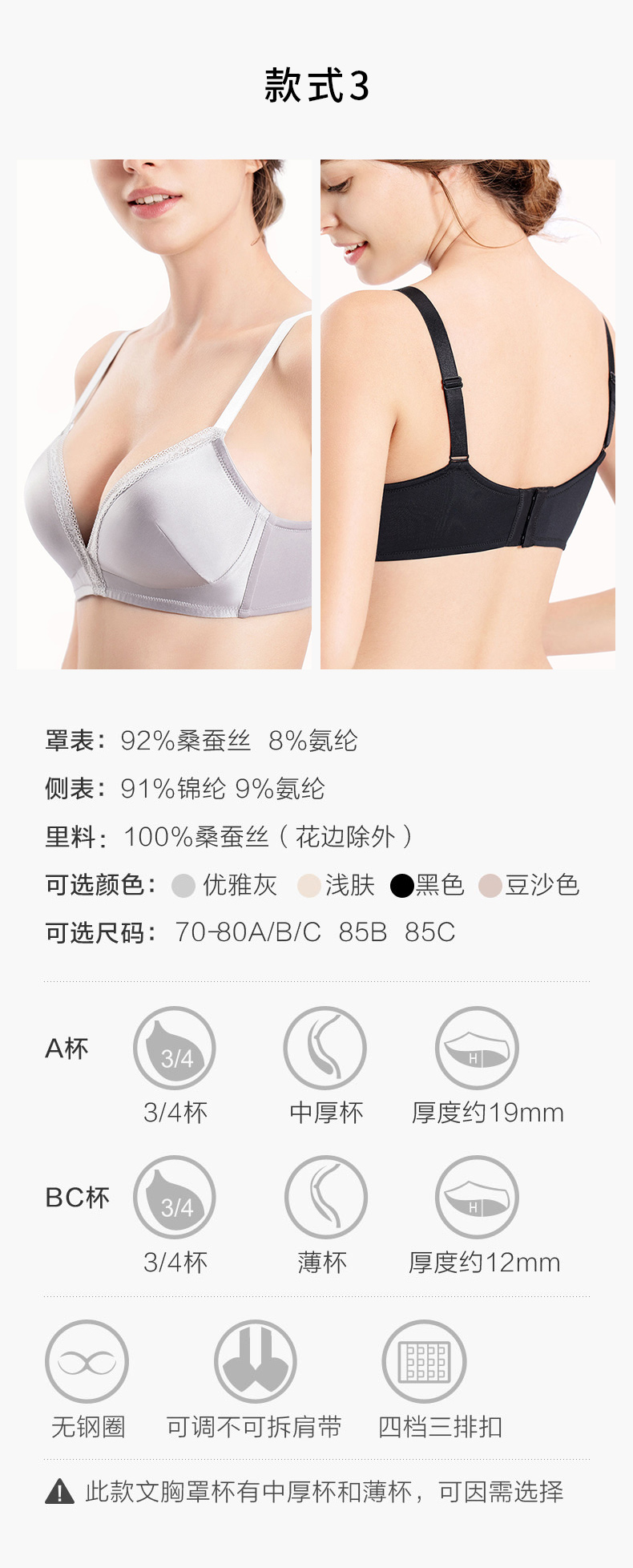 这款金三塔 真丝无钢圈无痕聚拢内衣,里料100%桑蚕丝,犹如第二层肌肤,70g面料手感更柔软,爽滑,舒适自在;3D立体模杯,贴合不空杯,夹弯侧推,加高耳仔,有效侧收;4排3扣,穿着稳定。