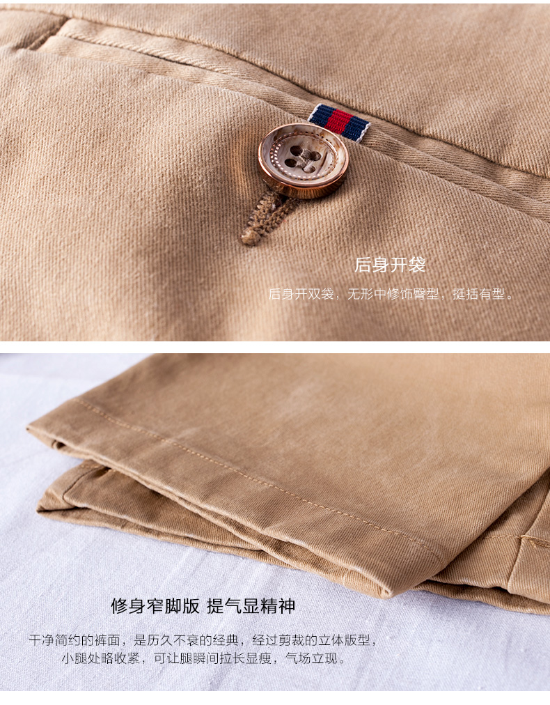 本米男士休闲裤,面料是斜纹线卡面料,以97%棉混3%氨纶弹力纤维,带有微弹力,穿着无拘束舒适度比较好。整体直筒版型,在小腿处略收紧,瞬间拉长腿部线条。除了左右裤袋,后身也有口袋。风格介于正装和休闲之间,面料厚度中等,四季可穿。