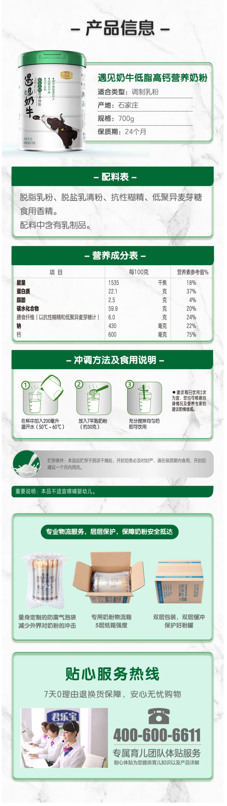 全新研制的配方,双倍钙含量、低脂肪、高蛋白、富含膳食纤维,满足身体营养所需。每100g含钙600mg,脂肪含量≤2.5g,膳食纤维有助于维持正常的肠道功能。