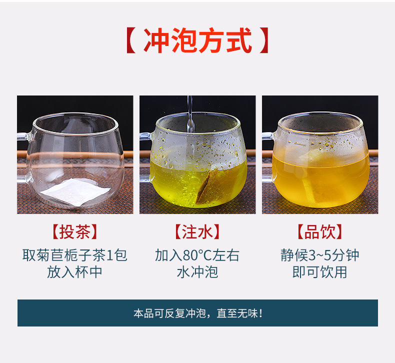 这款 菊苣栀子茶,精选新疆·阿勒泰 菊苣根、河南·唐河县 栀子、广西·藤县 葛根、四川·宁南县 桑叶、安徽·霍山 百合(按4:3:2:0.5:0.5科学黄金配比)、经过反复试验,不同材料研磨不同的粗细程度,使浸泡时析出快速全面,汤色澄亮,有淡淡清香,入口温和绵柔。食品级独立包装,双层保护,卫生便携。
