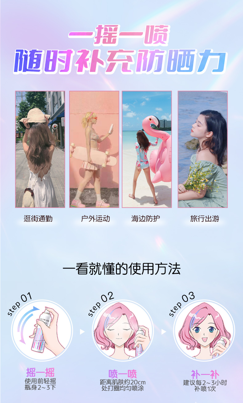 这款naris 高倍防晒喷雾,日本原装进口,采用安全环保技术研制,温和配方,敏感肌可用,外防晒内养肤,不受妆前妆后的困扰,随时随地喷一喷,可在肌肤表面迅速成膜,防水防汗,有淡雅花香,时效长达10小时以上,让你嗨玩夏日,放肆晒,规格:80g≈125ml。
