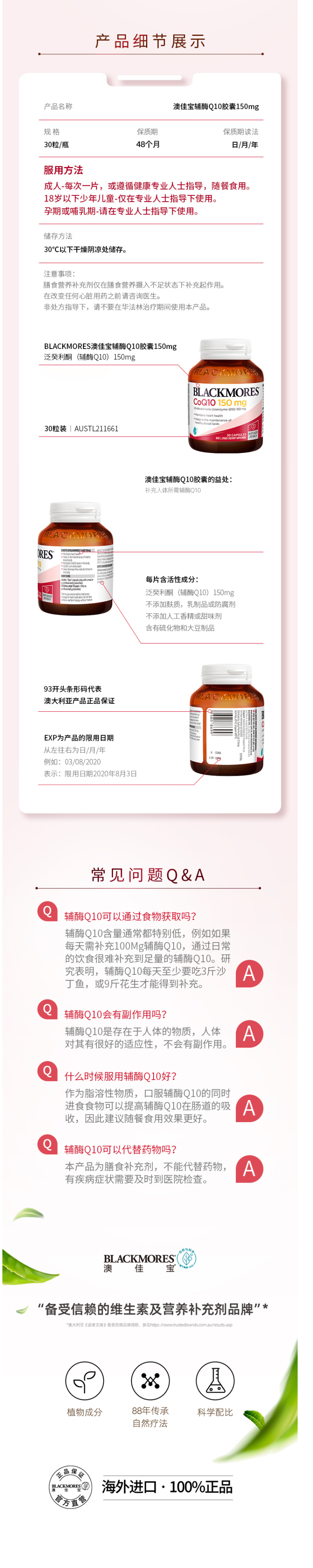 这款澳佳宝 Blackmores 辅酶素Q10软胶囊,澳洲原装进口,辅酶Q10能为心肌提供充足的氧气,活化心肌细胞。运用微生物进行发酵技术,让活性物质更充分释放。