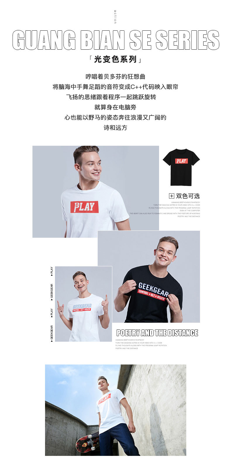 面料柔软顺滑,吸湿透气性好,穿着舒适。罗纹衣领,领肩线加固条设计,服帖有型,机洗不变形,很耐穿,简约印花,科技光变色,夏日百搭。
