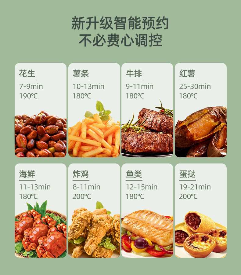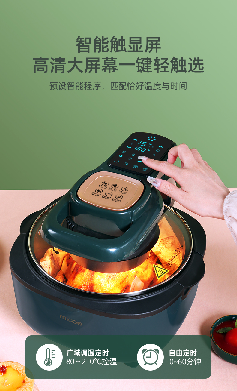 80-210℃广域调温,0-60分钟自由定时,4D热风循环,加热均匀拒绝烤焦烤糊,即可快速高温脱脂,同时也能锁住食材水分和营。