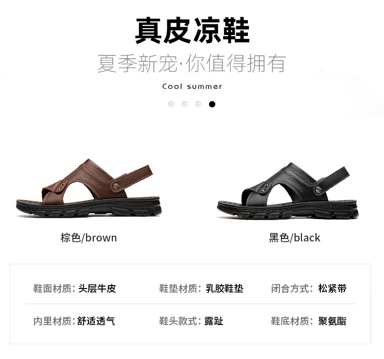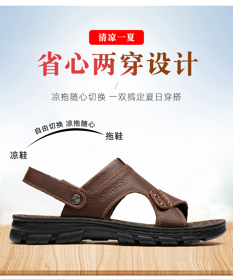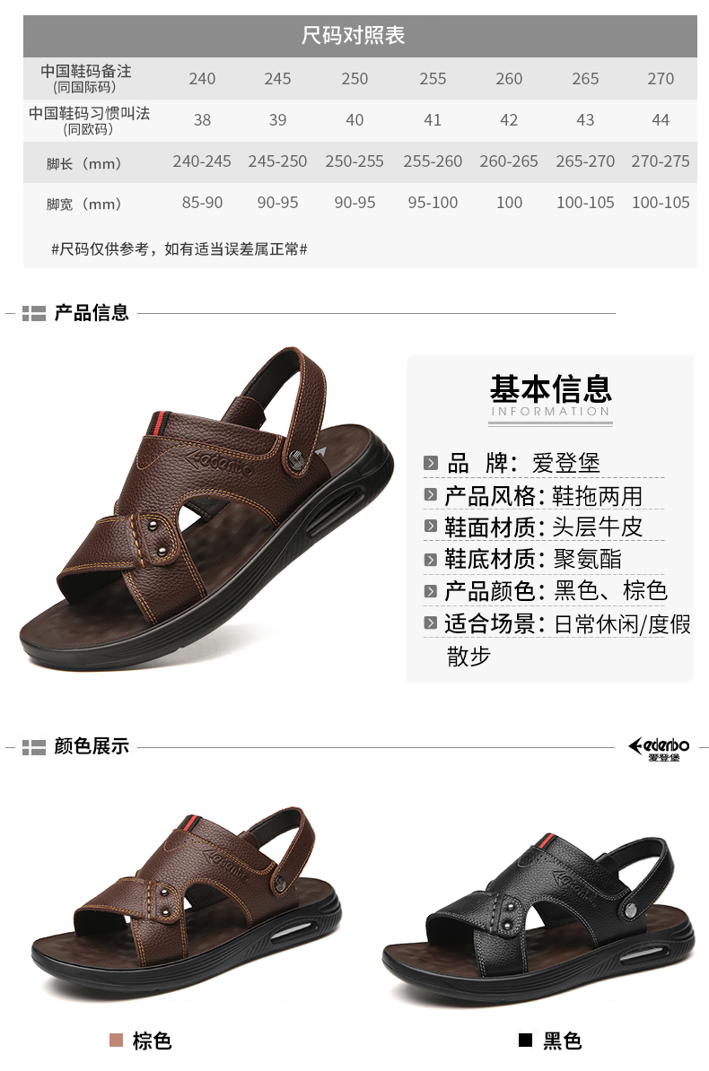 爱登堡 男式真皮凉鞋两用沙滩鞋 ,精选头层牛皮鞋面,柔软细腻,柔软透气,且有光泽;乳胶夹层鞋床,贴合省力,拒水打滑,行走省力不打滑;手工缝制,加厚按摩底,省心两穿设计,凉拖随心切换;弹力气垫鞋底,柔软舒适软弹。