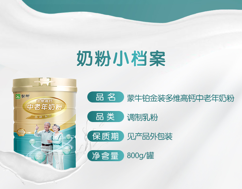 这款蒙牛 铂金 中老年高钙配方奶粉,是专门为中老年人群设计,根据中国人的身体需求设计,将依据低聚木糖IXOS1、乳双歧杆菌、钙等营养成分科学配比而成。