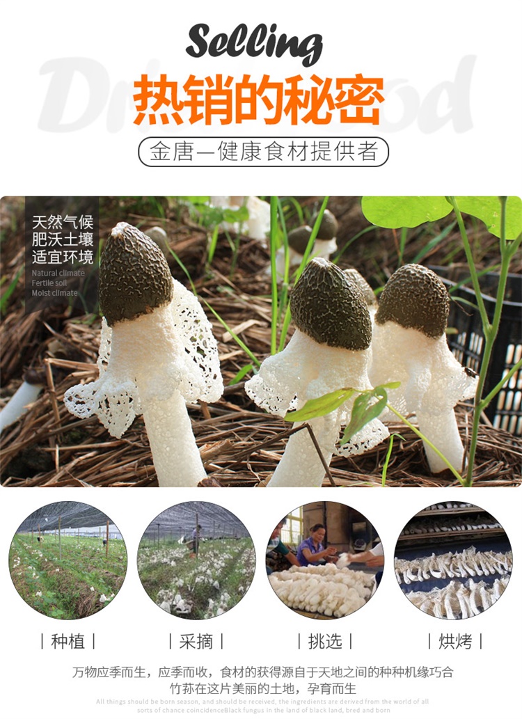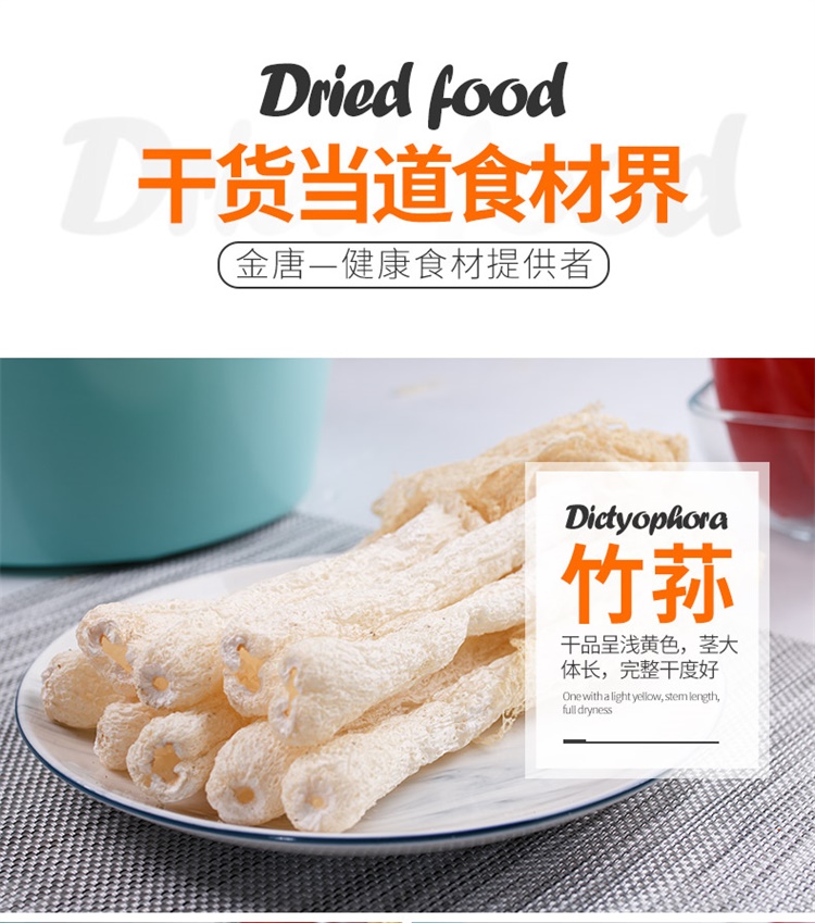 这款金唐无硫熏竹荪干货,产地是福建古田,选用优质新鲜竹荪经慢火烘干而成,不用硫熏,使竹荪呈自然的淡黄色,同时完美的锁住营养精华,最后是8比1的制干比例。