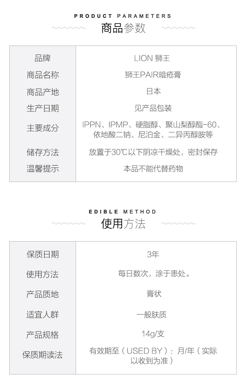 这款 LION 狮王 PAIR 祛痘暗疮膏,采用IPPN + IPMP双重治疗成分,速效消除开/闭口粉刺、退红抗炎。针对红肿、化脓的痘痘,具有排出脂肪粒、杀灭原因菌、消除红肿的3道功效。对正在生长的痘痘,抑制脂肪粒的形成并逐渐消除。对已经成熟的痘痘,能够析出脂肪粒,从痘痘根部进行治疗。药膏呈弱酸性,接近皮膚的PH值,非常温和,使用起來不粘腻。清爽易吸收,纯植物低刺激,还有好闻的香味。
