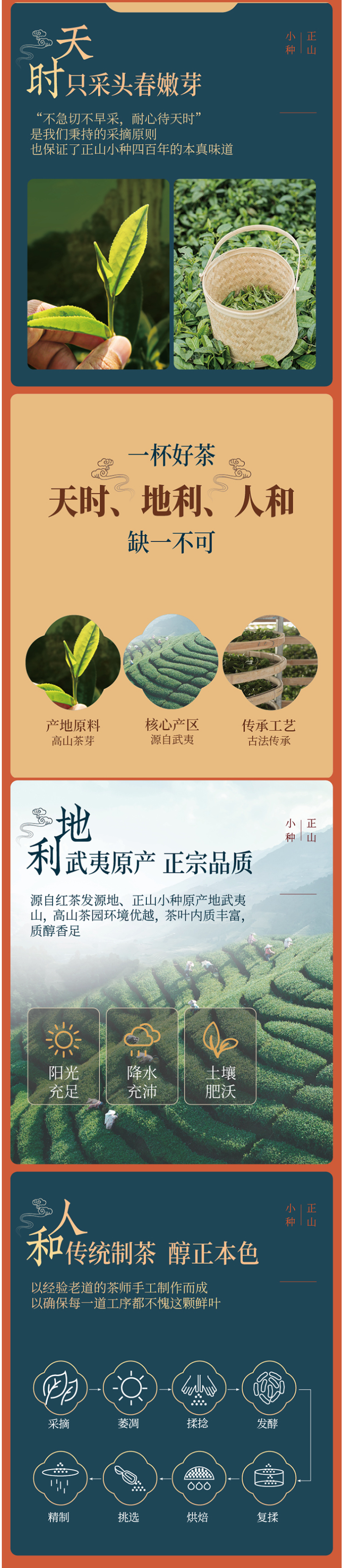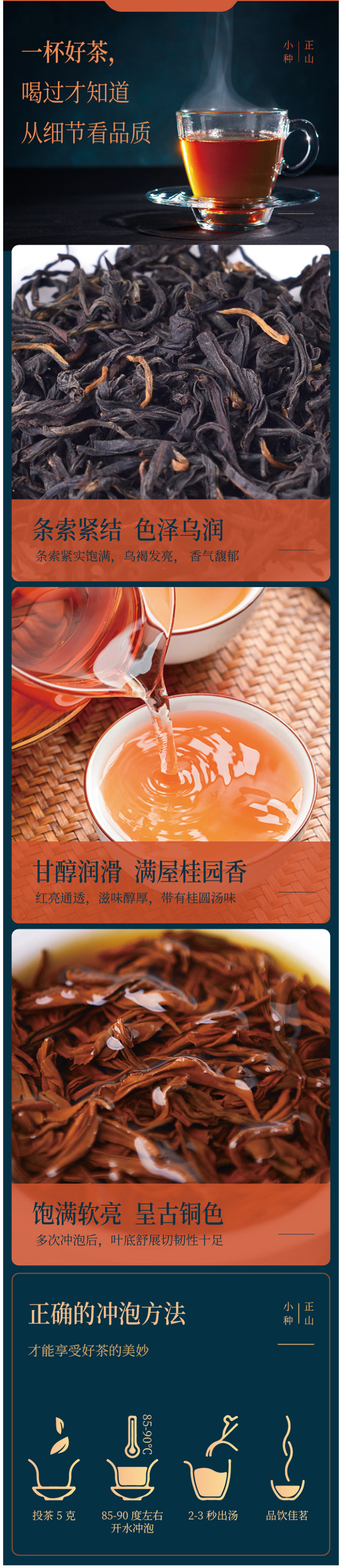这款茶人岭的正山小种红茶,干茶条索紧结、匀整,色泽乌润、金毫显,汤色橙红明亮,滋味爽口、活泼且醇;冲泡后有天然的桂圆香味,又不至于太过浓烈,茶香细腻含蓄,恰到好处,得益于武夷山得天独厚的自然生态环境,此茶六泡而有余味。