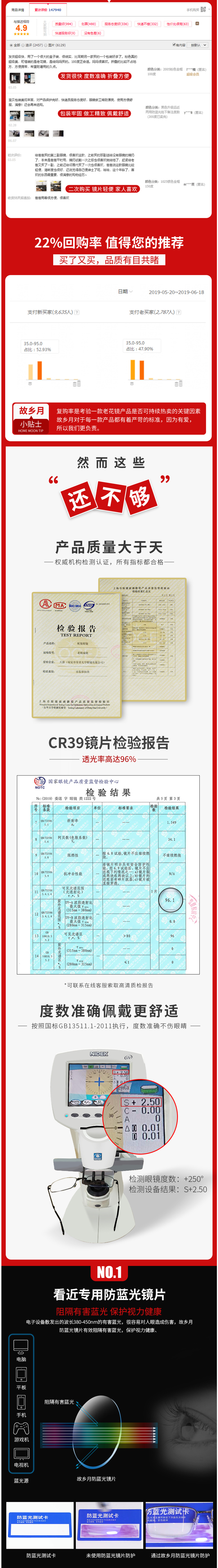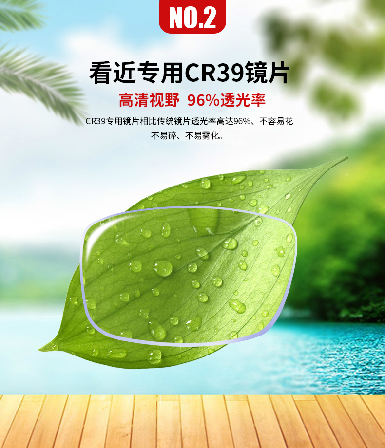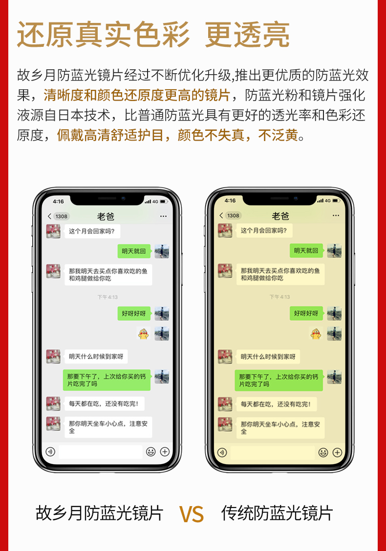 故乡月传统镜片透光率93%、防蓝光镜片95%、CR39镜片高达96%,透光率越高镜片越清晰。