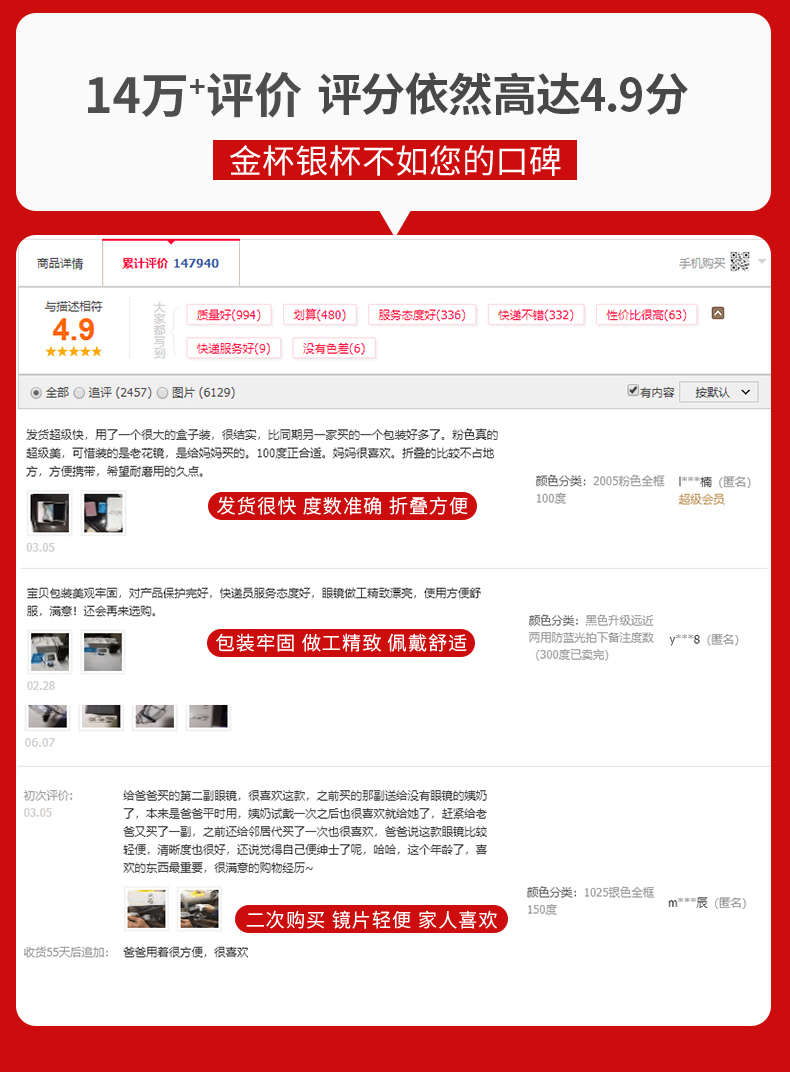 度数上是100度、150度、200度、250度、300度、350度,有看近、看远和看近+看远可选,累计有8.8万的4.9分好评。