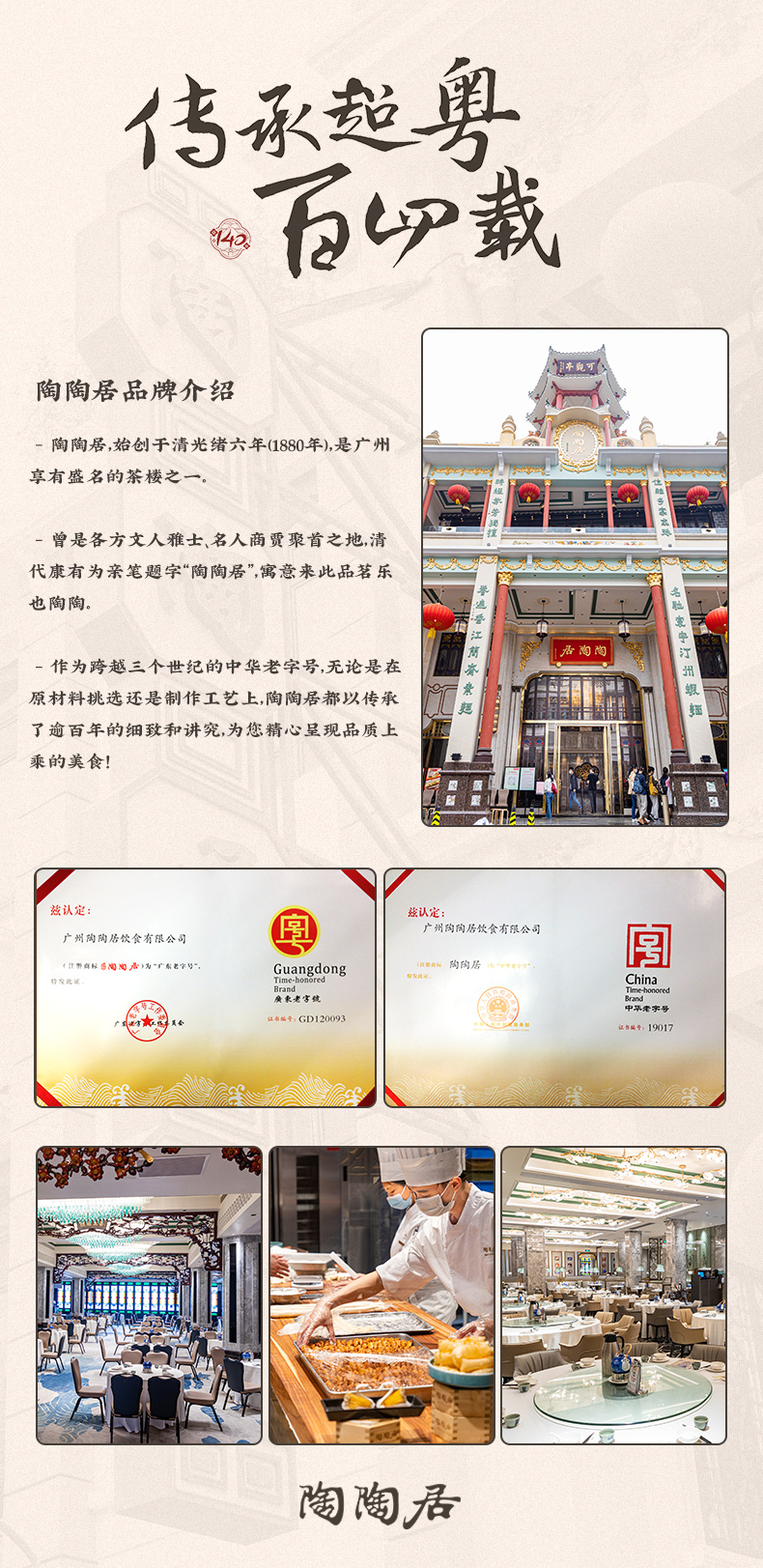 陶陶居创立于清光绪六年(1880年)「官网地址」,是广州饮食业中的老字号之一,也是广州最有名气的茶楼之一,主要经营名茶、茶点、茶食及酒菜餐饮。