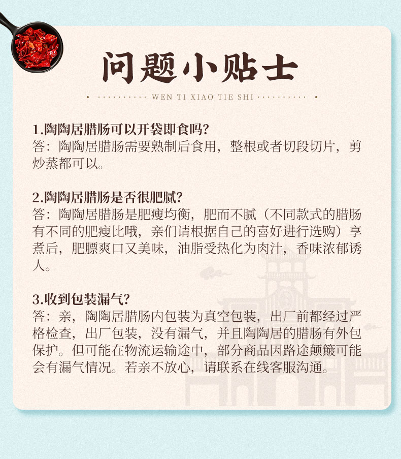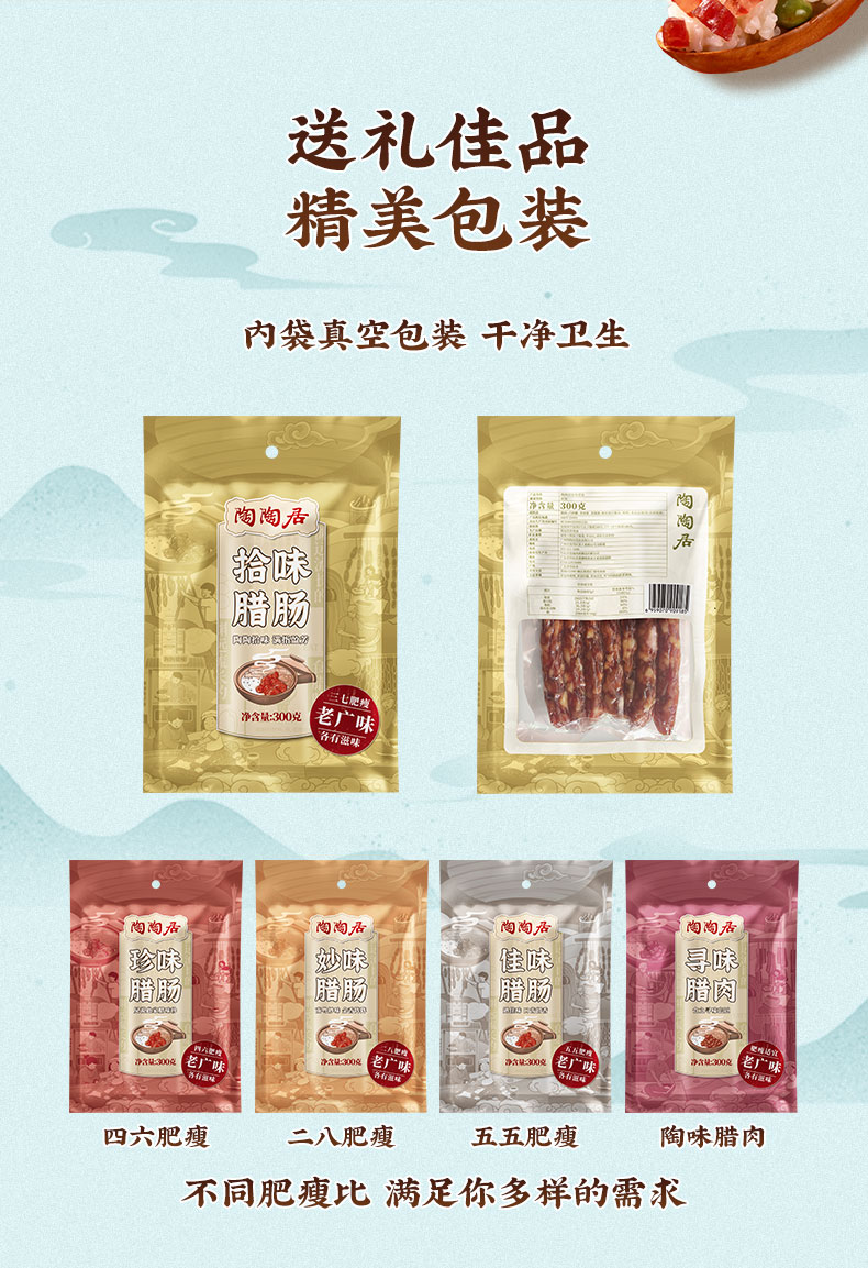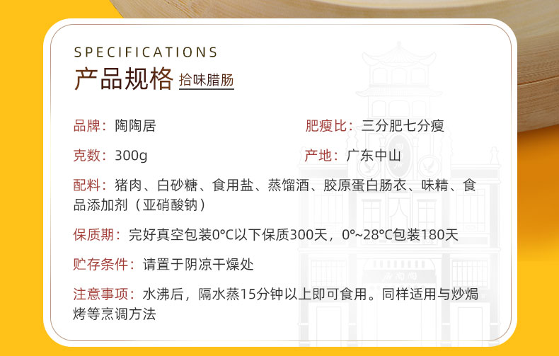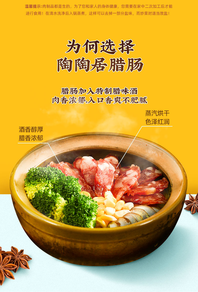 陶陶居 广式三七腊肠,精选肥瘦均匀好猪肉原料,三七肥瘦配方,搭配地道的糖酒风味,以糖中和调味、嫩化肉质,以酒激发鲜味、增加醇香,造就鲜、香、微甜的风味。