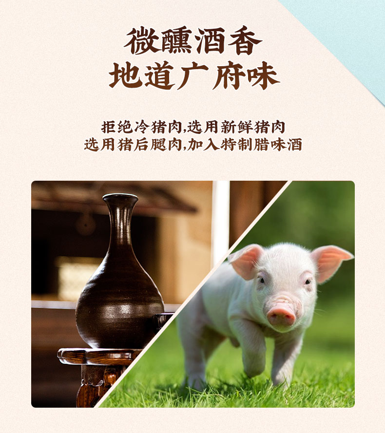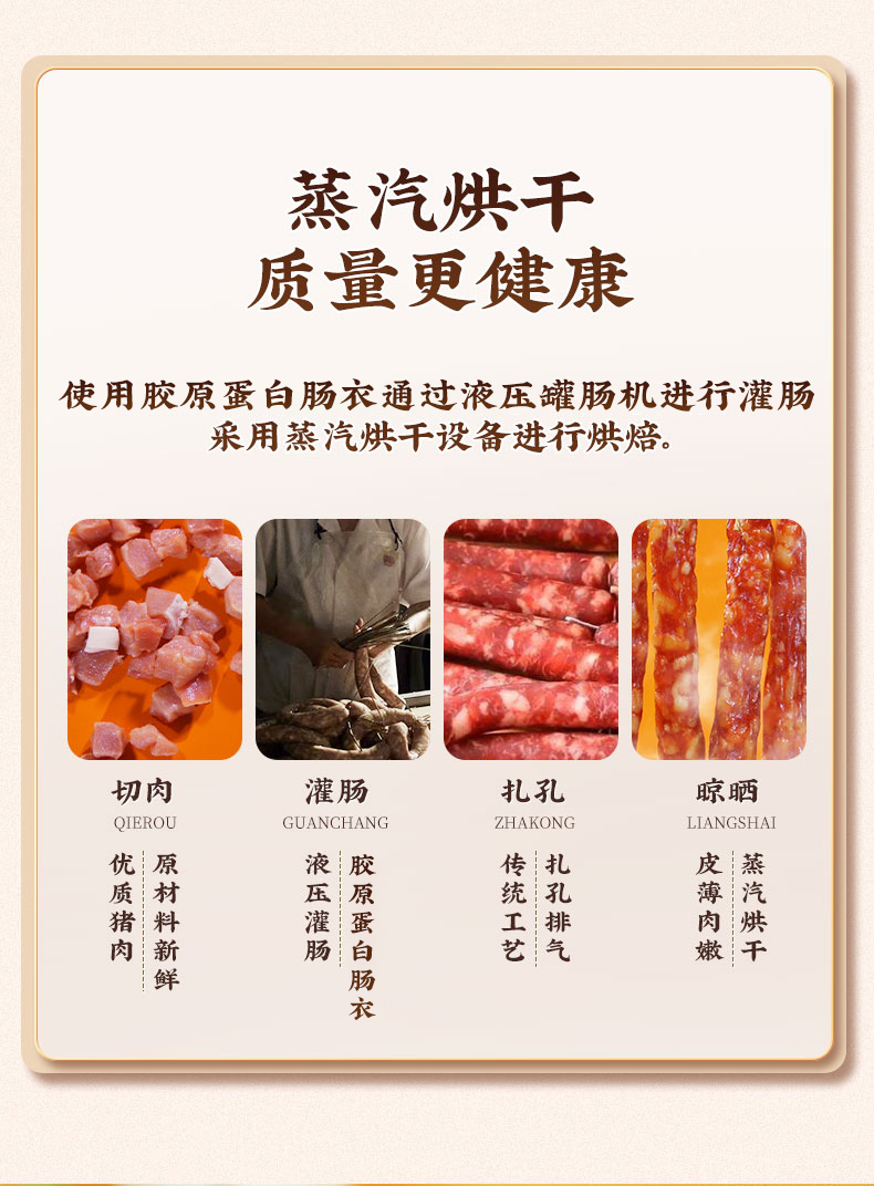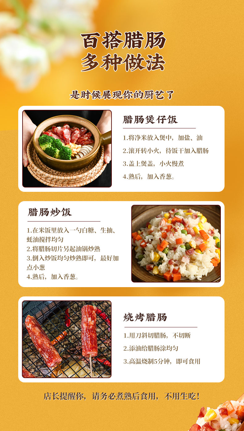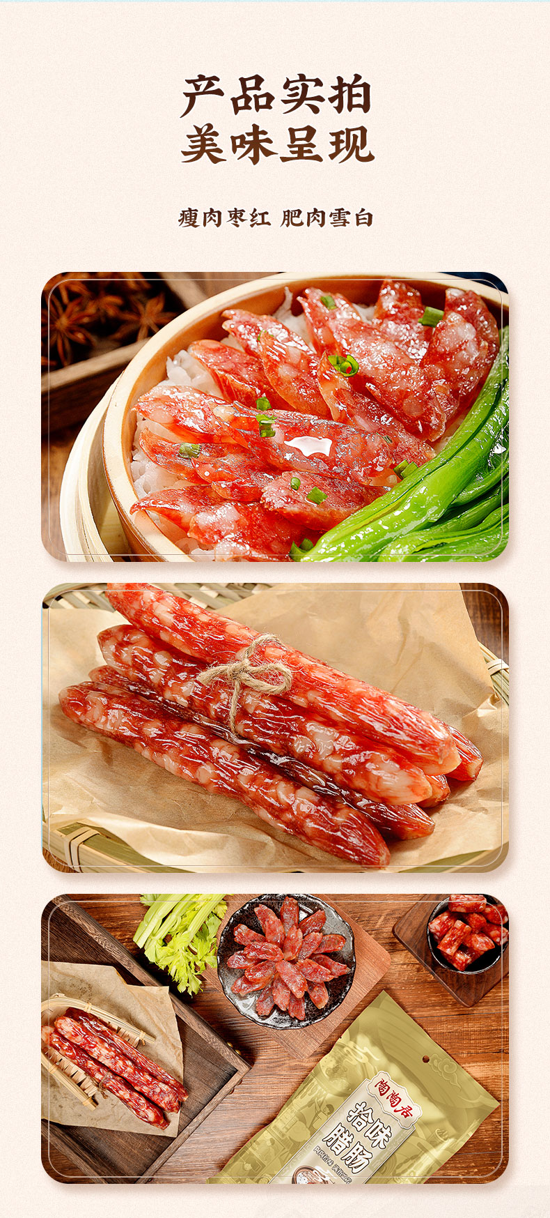 遵循传统腊肠制作技艺,历经十几道工序制成,外形紧致、色泽光润,肉质紧实有嚼劲。标准化生产车间,食用健康安全。非常适合炒菜、煲饭,也可作凉菜、拌炒、蒸煮食用。
