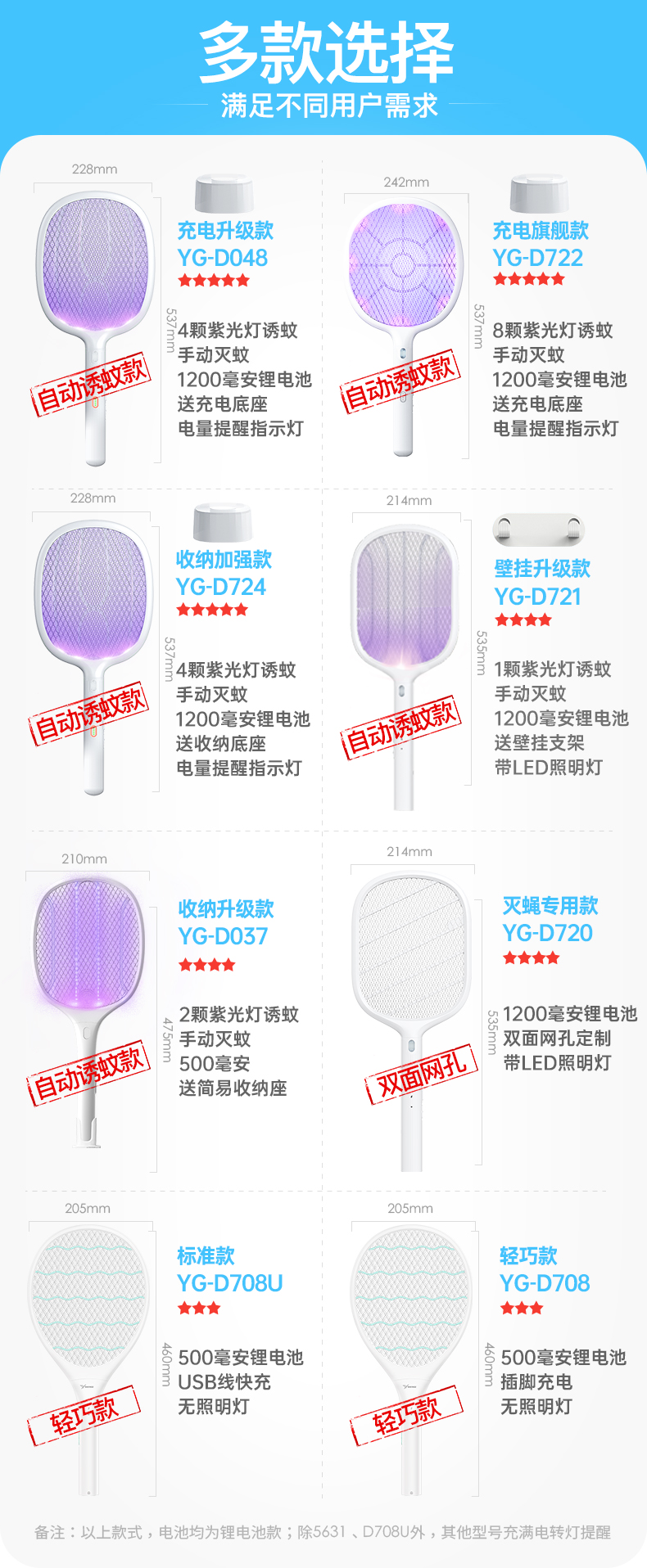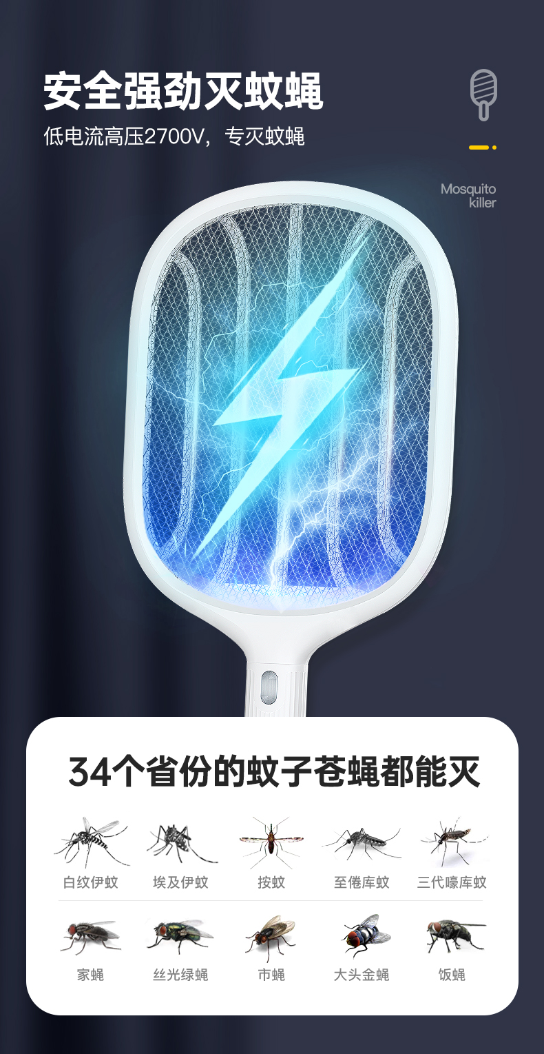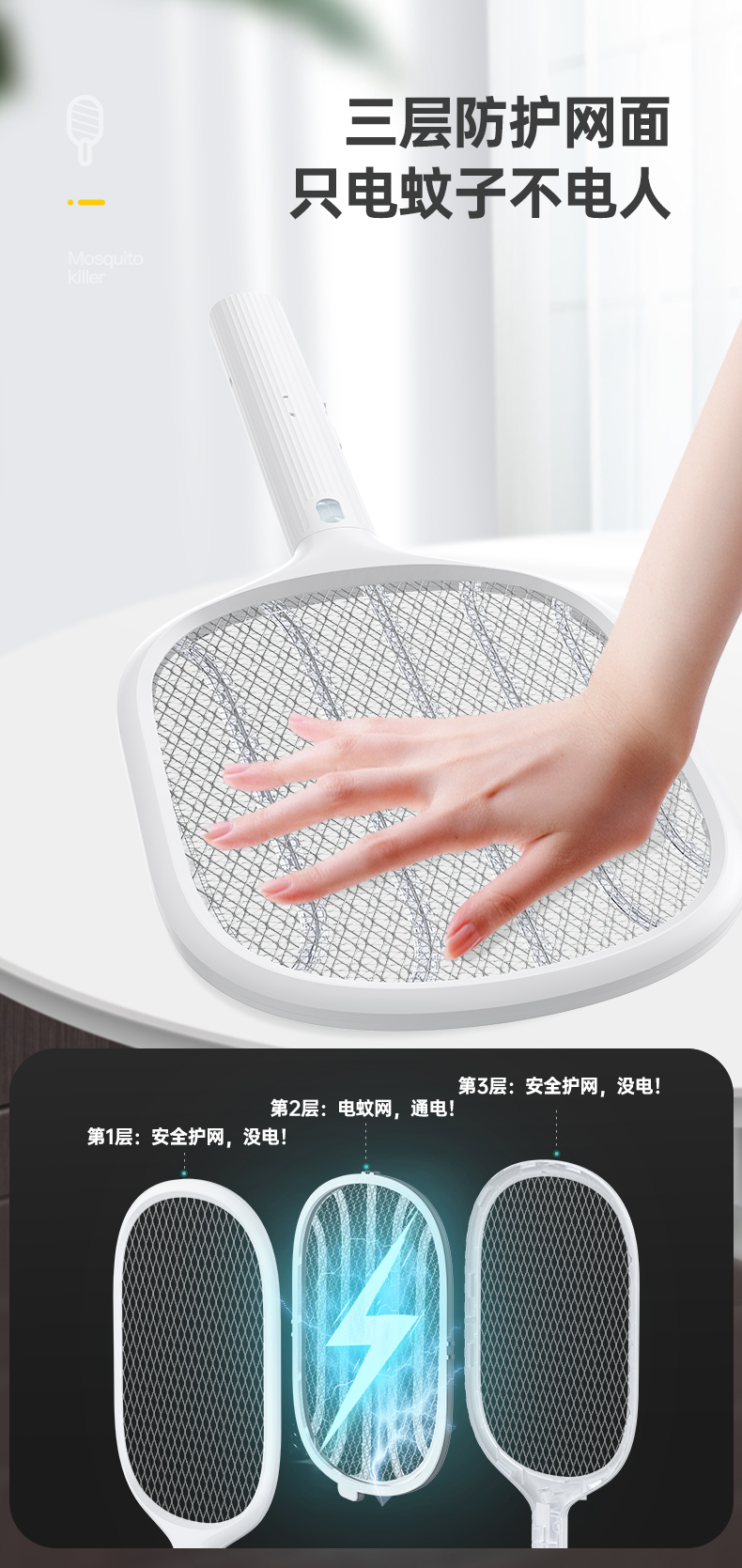 第1款此价,三层防护网面只电蚊子不电人,内置500mAh电池。带有隐藏式伸缩插脚设计,方便充电收纳。